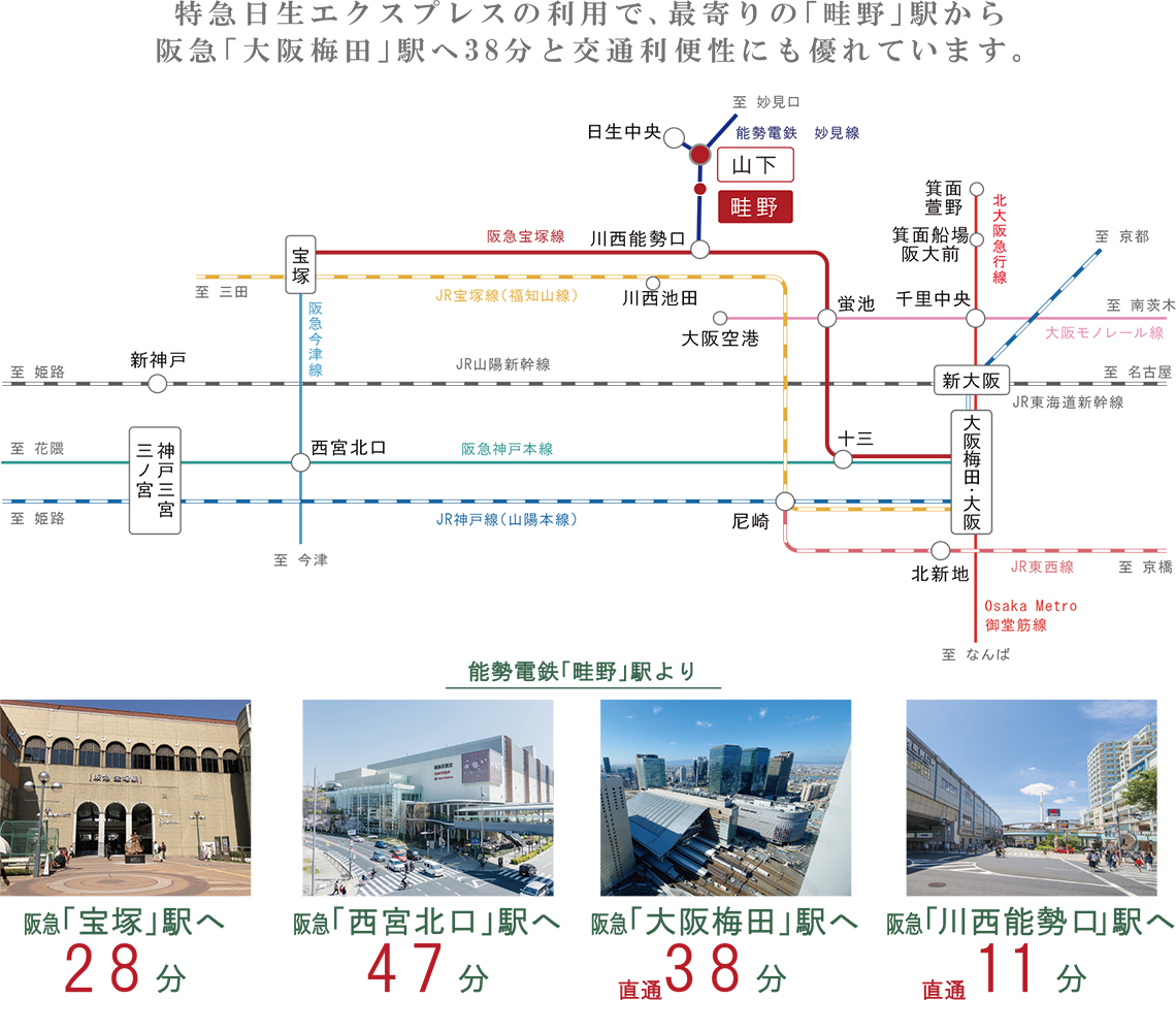 能勢電鉄妙見線「畦野」駅より:「宝塚」駅へ能勢電鉄妙見線直通特急大阪梅田(阪急)行き、「川西能勢口」駅で乗り換え、阪急宝塚本線急行宝塚行き/「西宮北口」駅へ能勢電鉄妙見線直通特急大阪梅田行き、「十三」駅で乗り換え、阪急神戸本線西宮北口行き/「大阪梅田」駅へ能勢電鉄妙見線/阪急宝塚本線直通特急大阪梅田行き/「川西能勢口」駅へ能勢電鉄妙見線直通特急大阪梅田行き※表示分数は朝のラッシュ時(07:00~09:00)のもので、時間帯により所要時間が異なります。乗換え、待ち時間は含まれております。※2025年8月現在のダイヤによるもので、今後ダイヤ改正等により変更する可能性がありますのでご了承下さい。