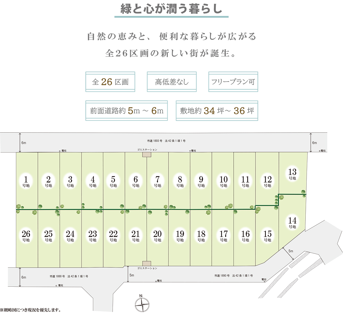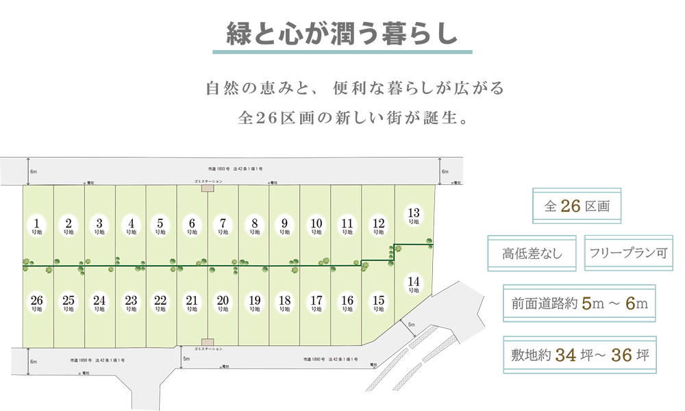 - 全26区画のビックプロジェクト!広さ34坪~36坪のゆとりある街区設計
