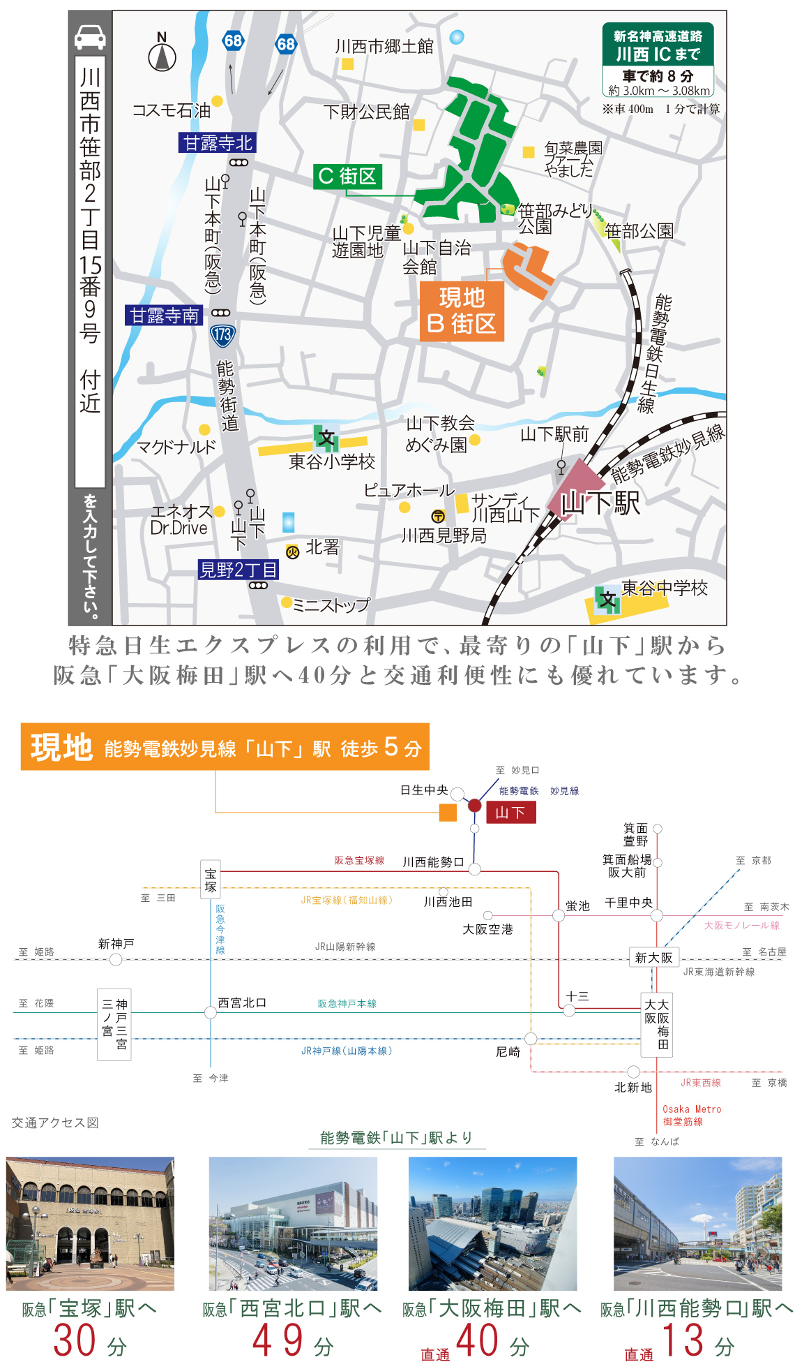 能勢電鉄「山下」駅より:「宝塚」駅へ能勢電鉄日生線直通特急利用、「川西能勢口」駅で阪急宝塚線急行に乗り換え/「西宮北口」駅へ能勢電鉄日生線普通利用、「川西能勢口」駅で阪急宝塚線急行に乗り換え、「宝塚」駅で阪急今津線普通に乗り換え/「大阪梅田」駅へ能勢電鉄日生線直通特急利用で直通/「川西能勢口」駅へ能勢電鉄日生線直通特急利用で直通 ※表示分数は朝のラッシュ時(7:00~9:00)のもので、時間帯により所要時間が異なります。乗換え、待ち時間は含まれております。※2026年1月現在のダイヤによるもので、今後ダイヤ改正等により変更する可能性がありますのご了承下さい。