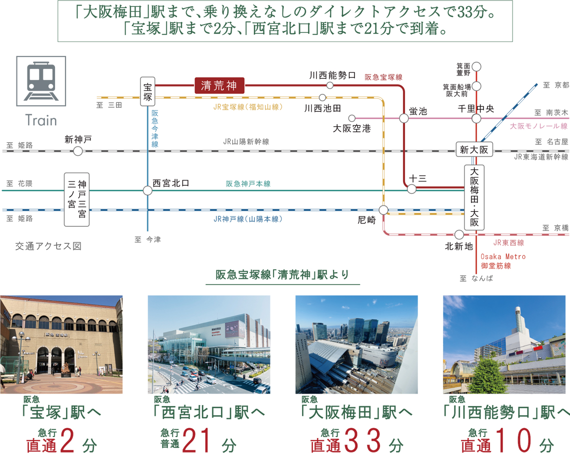 阪急宝塚線「清荒神」駅より:「宝塚」駅へ阪急宝塚本線急行宝塚行き/「西宮北口」駅へ阪急宝塚本線急行宝塚行き、「宝塚」駅で乗り換え、阪急今津線普通西宮北口行き/「大阪梅田」駅へ阪急宝塚本線急行大阪梅田行き/「川西能勢口」駅へ阪急宝塚本線大阪梅田行き※表示分数は朝のラッシュ時(07:00~09:00)のもので、時間帯により所要時間が異なります。乗換え、待ち時間は含まれております。※2025年9月現在のダイヤによるもので、今後ダイヤ改正等により変更する可能性がありますのでご了承下さい。