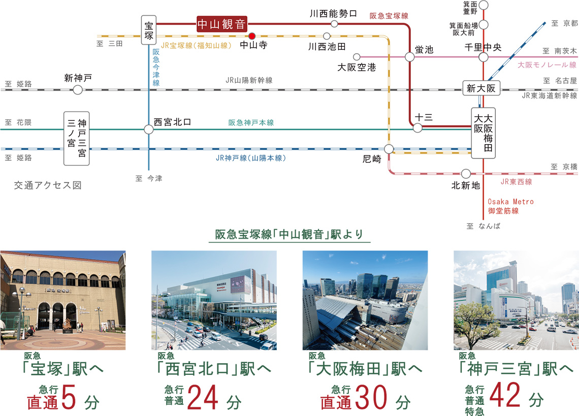 阪急宝塚線「中山観音」駅より:「宝塚」駅へ阪急宝塚本線急行宝塚行き/「西宮北口」駅へ阪急宝塚本線急行宝塚行き、「宝塚」駅で乗り換え、阪急今津線普通西宮北口行き/「阪急梅田」駅へ阪急宝塚本線急行大阪梅田行き/「神戸三宮」駅へ阪急宝塚本線急行宝塚行き、「宝塚」駅で乗り換え、阪急今津線普通西宮北口行き、「西宮北口」駅で乗り換え、阪急神戸本線新開地行き※表示分数は朝のラッシュ時のもので、時間帯により所要時間が異なります。乗換え、待ち時間は含まれております。※2025年10月現在のダイヤによるもので、今後ダイヤ改正等により変更する可能性がありますのご了承下さい。