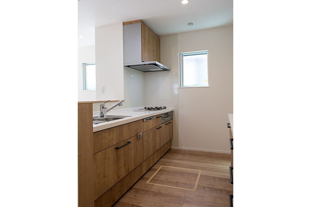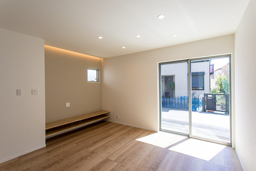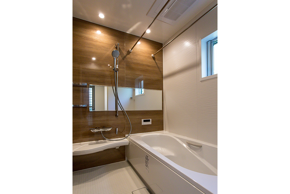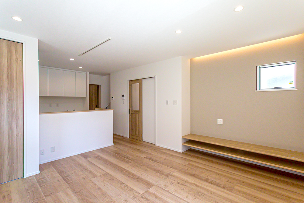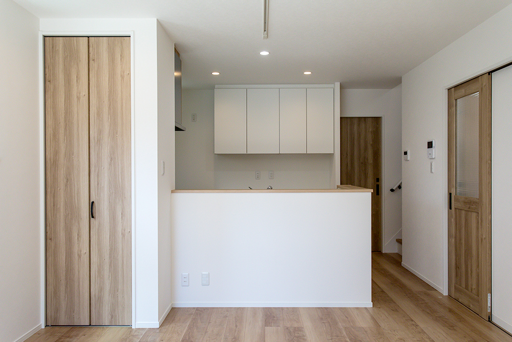 限られた延床面積の空間を有効活用し、随所に木のぬくもりを感じる1邸