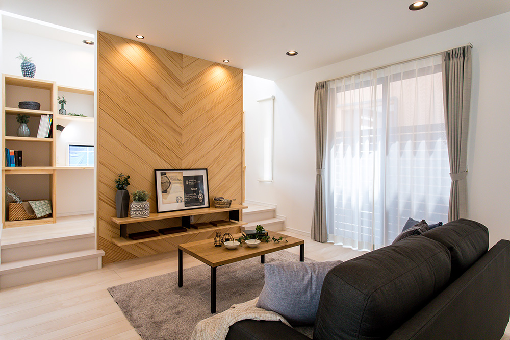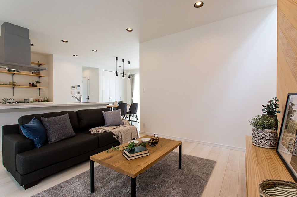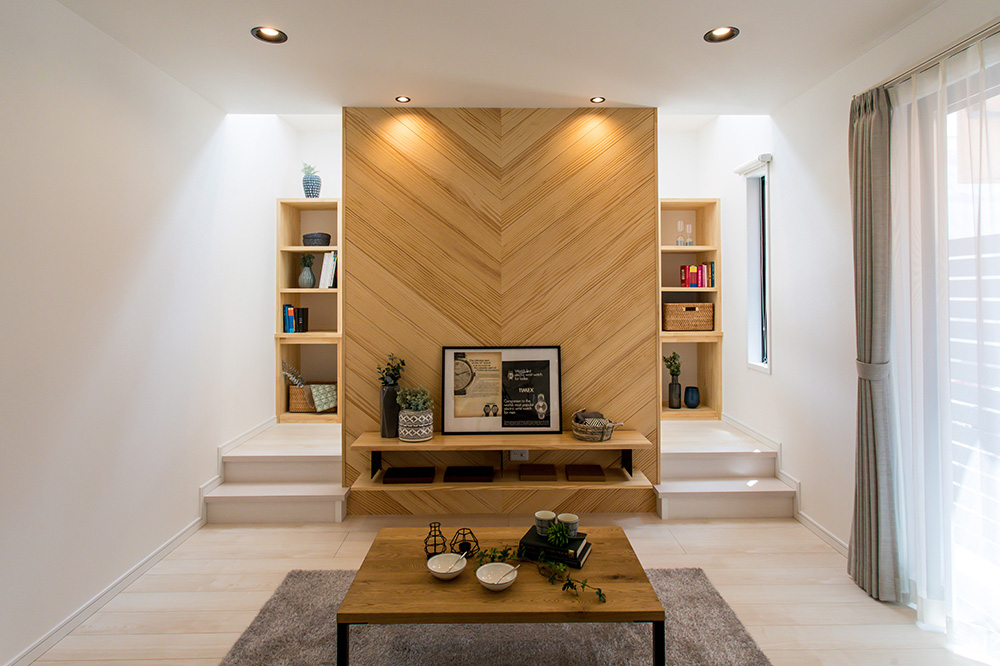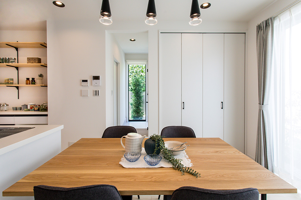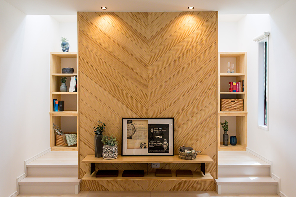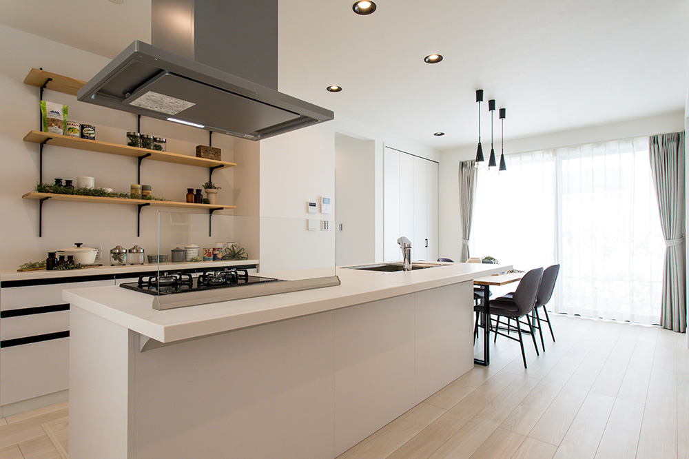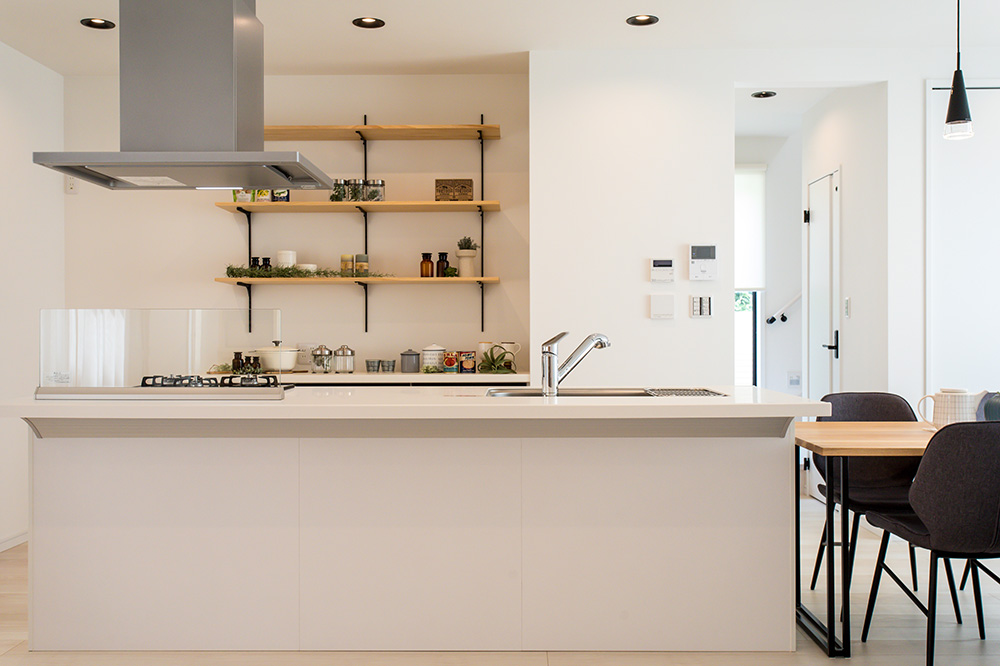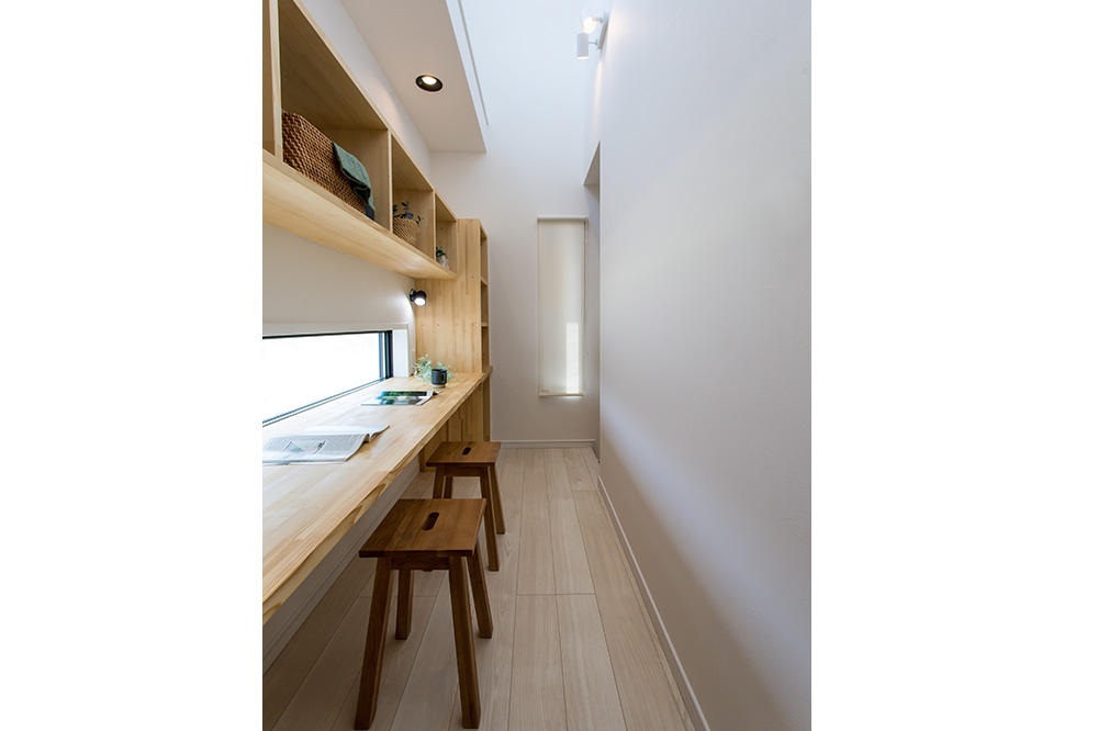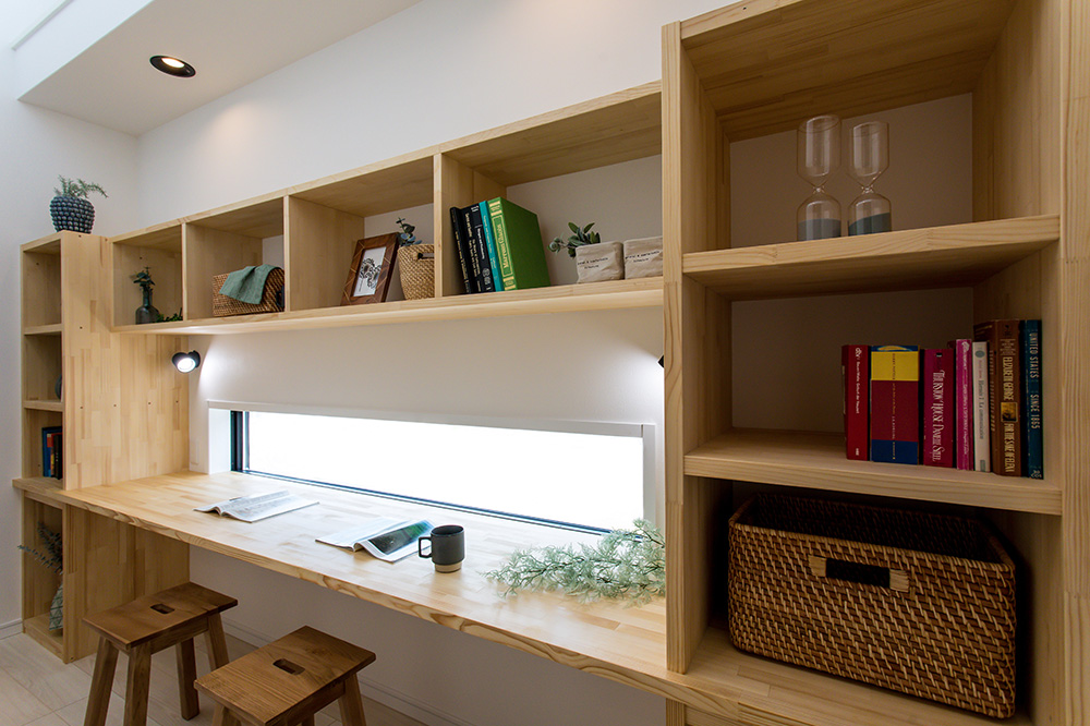 「LibrarySpace」のある家 家族共有の図書スペースで読書やホームワークができます。吹き抜けとアイランドキッチンを併用することで一体感のある空間を実現。