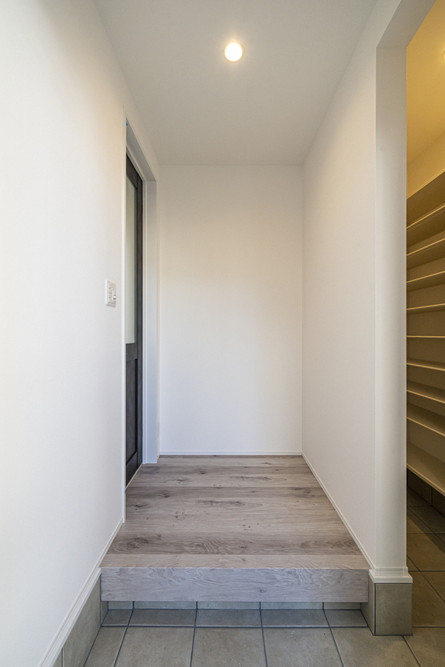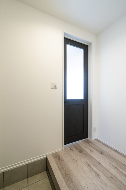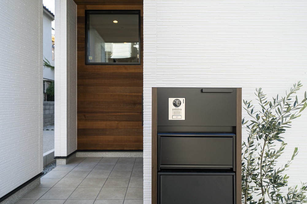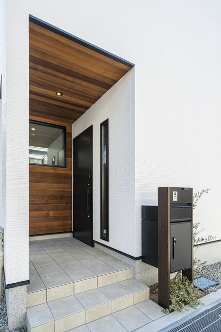 玄関のアクセントに天然木のレッドシダーを使用。