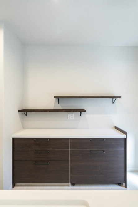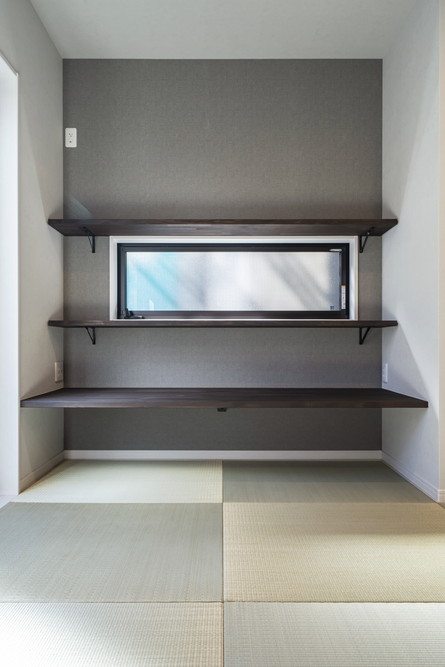 玄関のアクセントに天然木のレッドシダーを使用したデザイン住宅 タタミコーナーや主寝室内にカウンターを設置しワークスペースにも対応