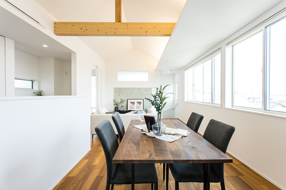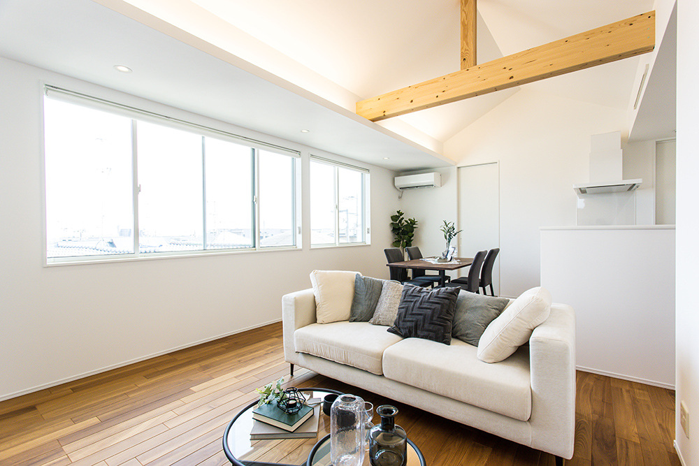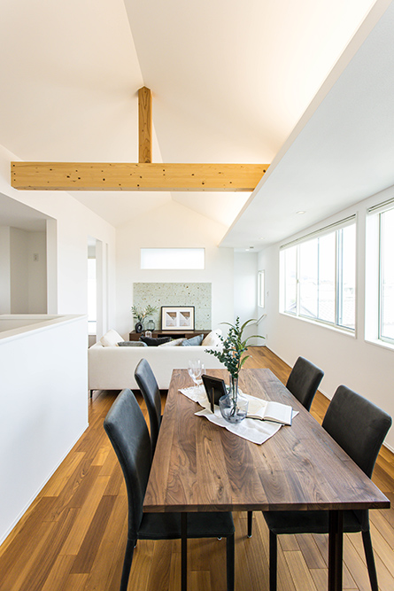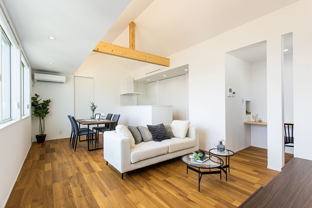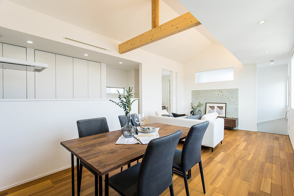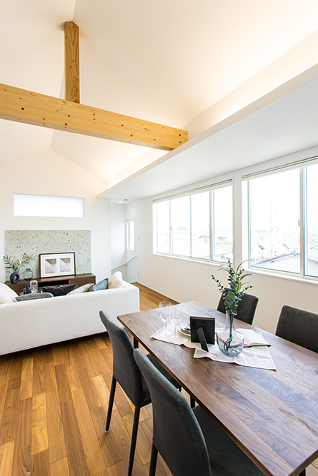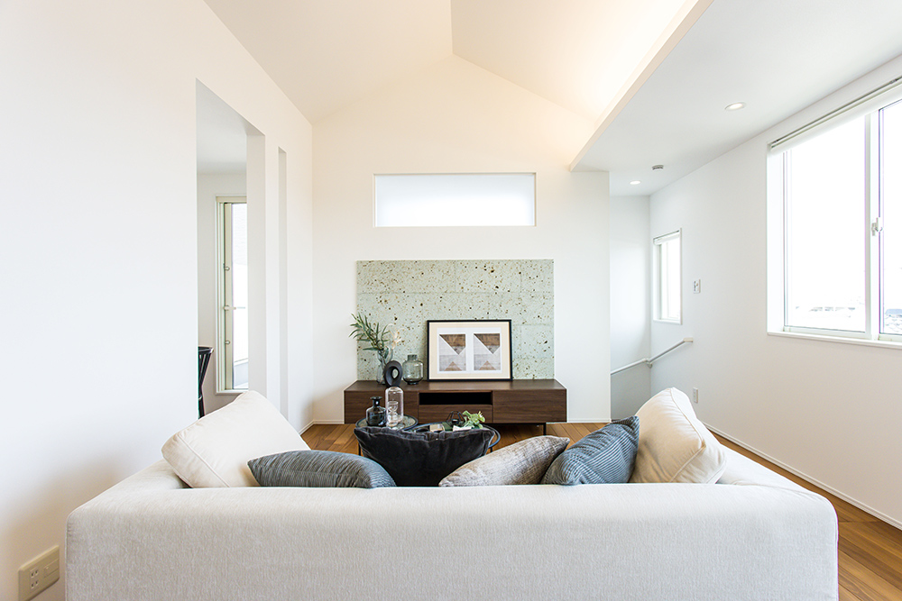 デザイン性に優れた「化粧梁」、「勾配天井間接照明」や TV壁面に「大谷石」をあしらえた魅力的なリビング空間