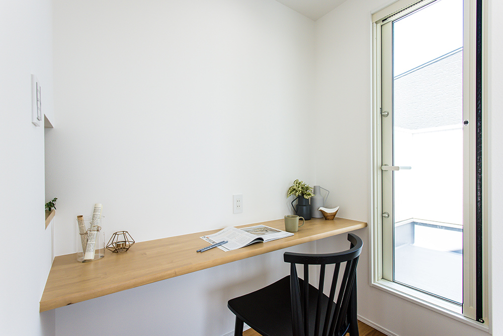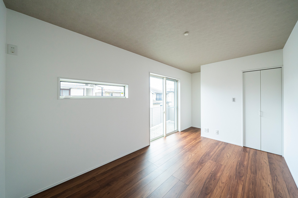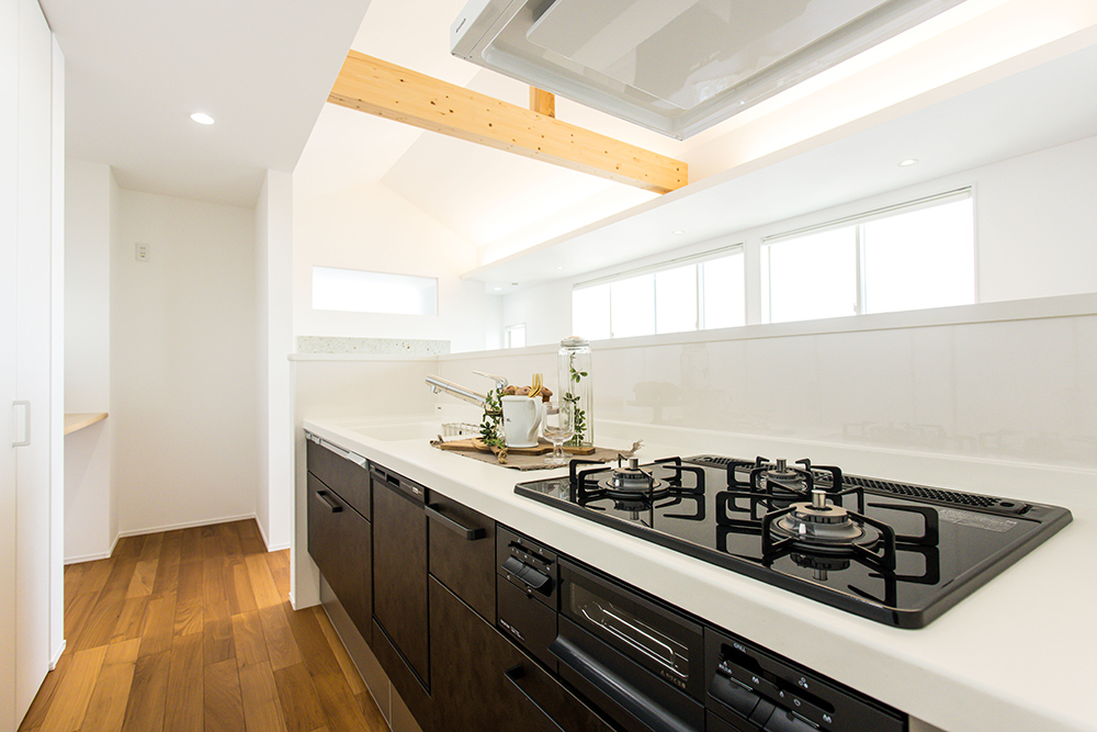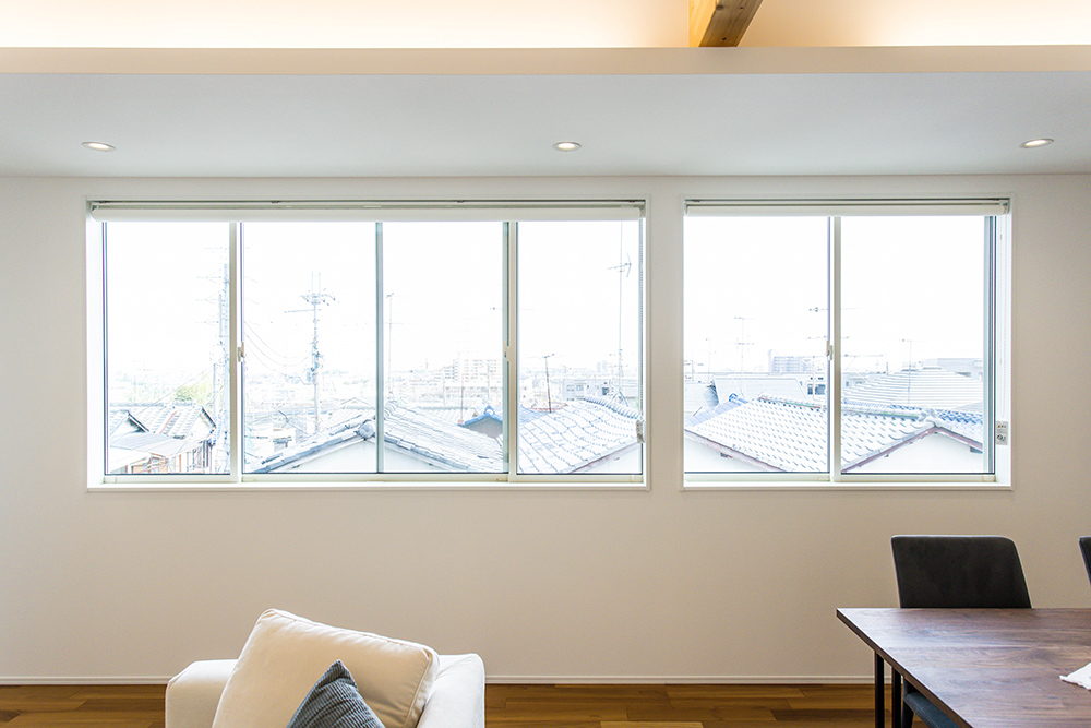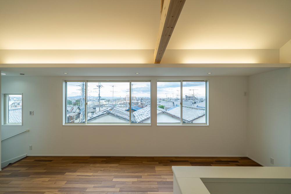 デザイン性に優れた「化粧梁」、「勾配天井間接照明」や TV壁面に「大谷石」をあしらえた魅力的なリビング空間