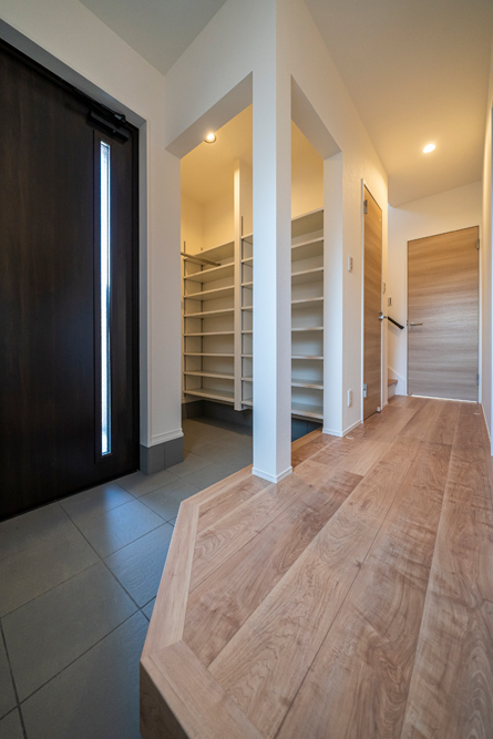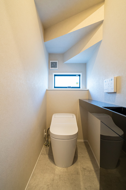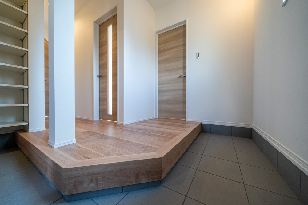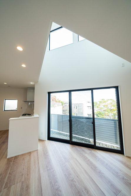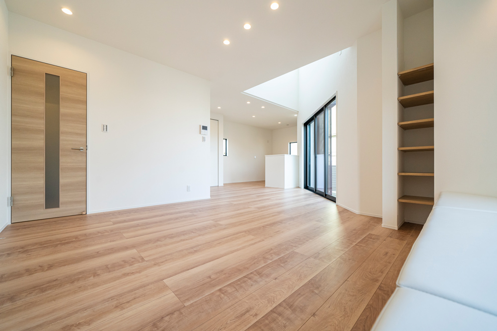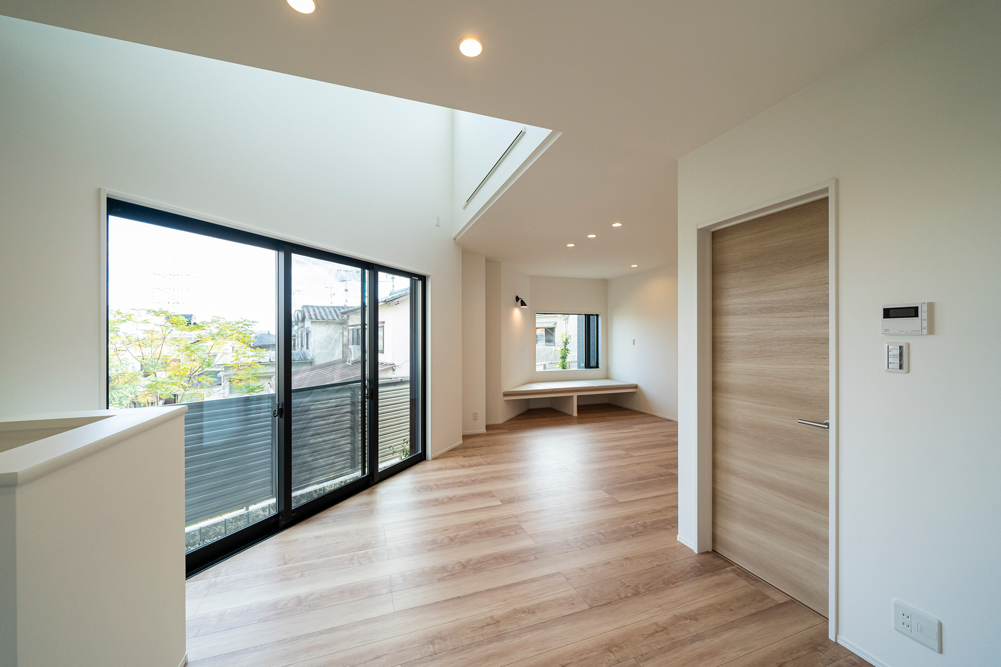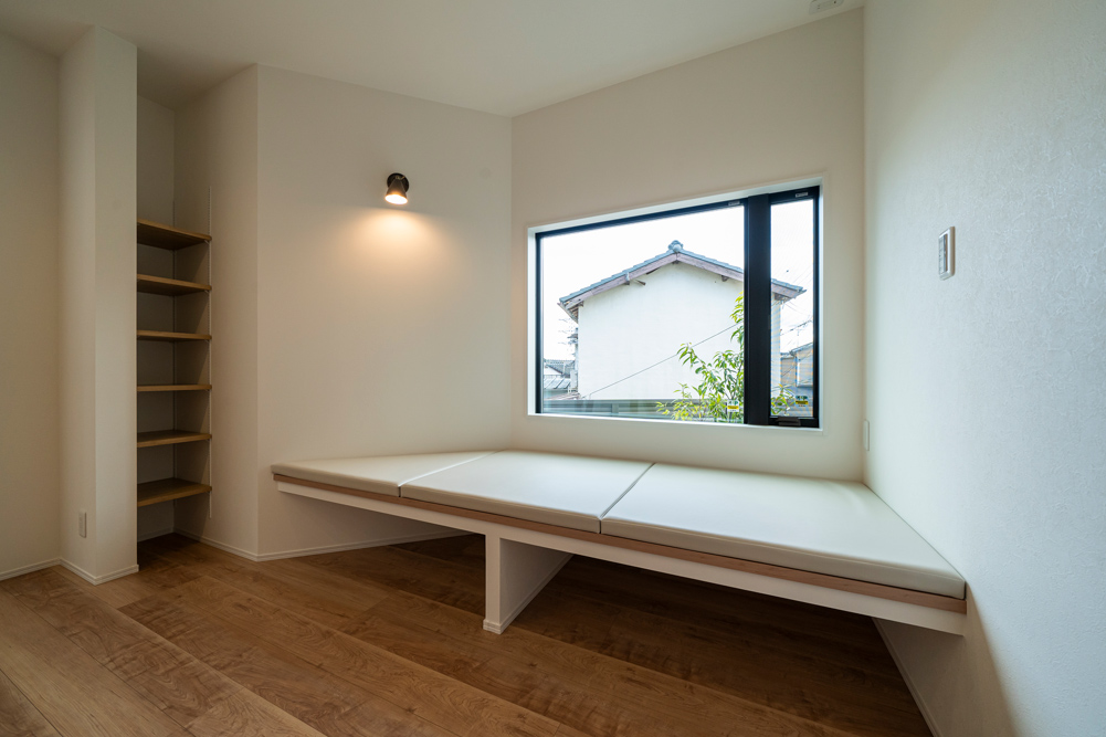 「吹抜け×三連窓」の大開口を設けたリビングルームの一角には、 くつろぎの「ベンチコーナー」を採用。家族みんなが使える癒しのスポットに!