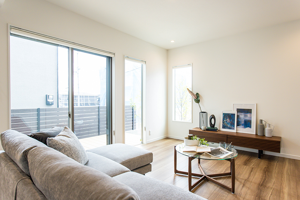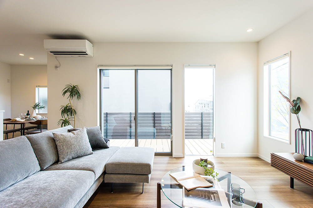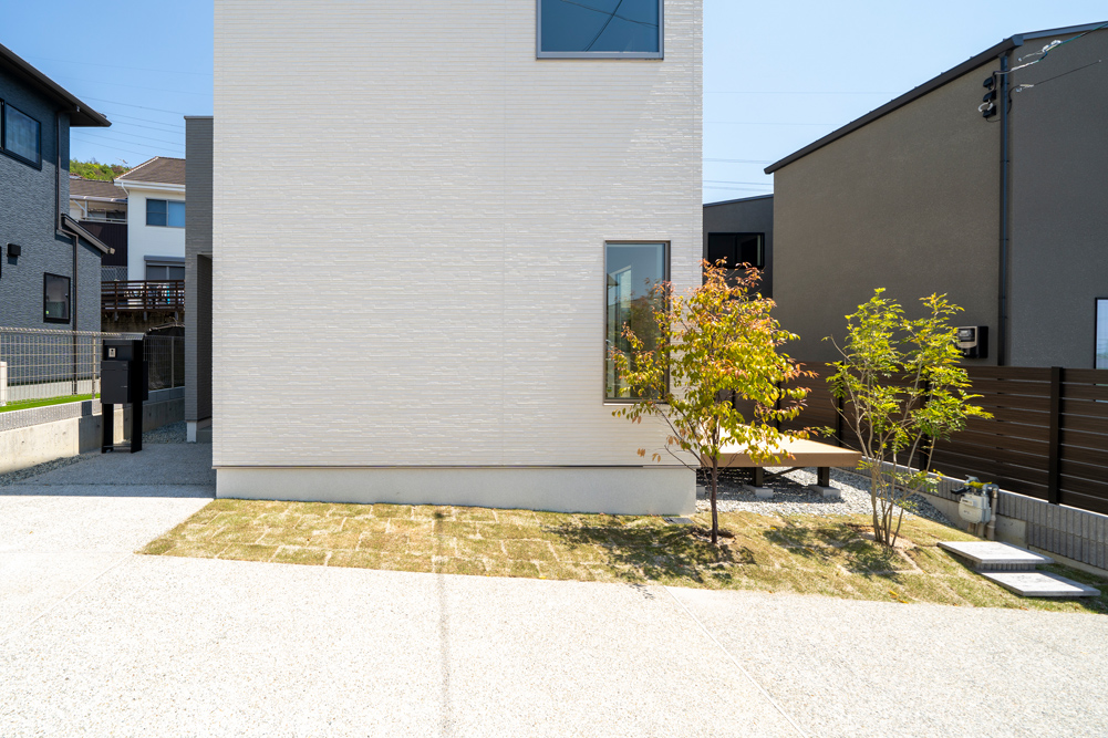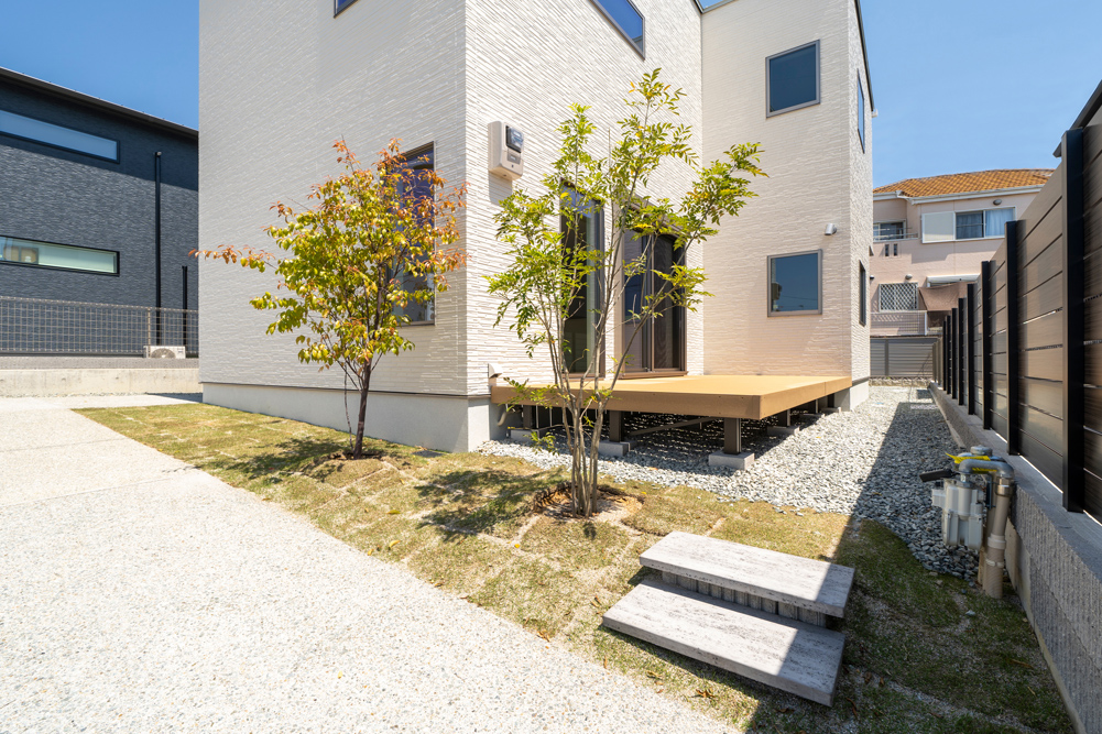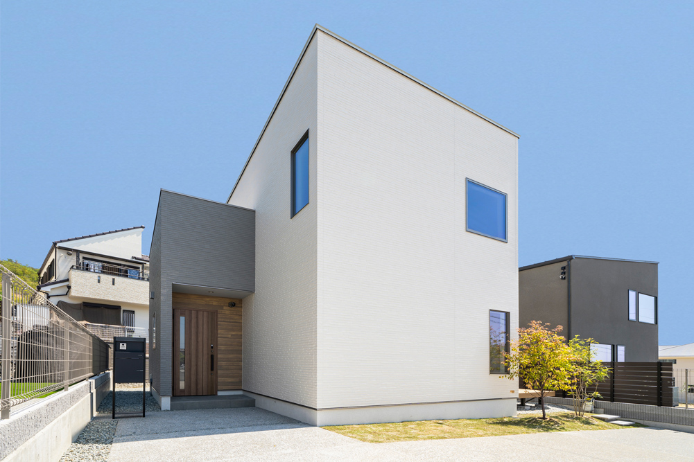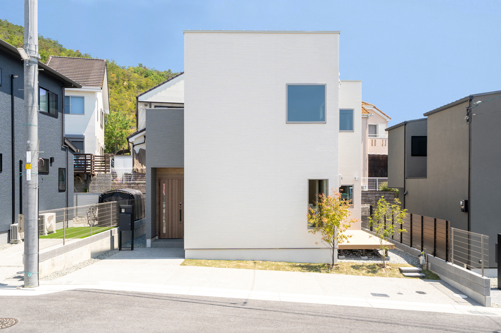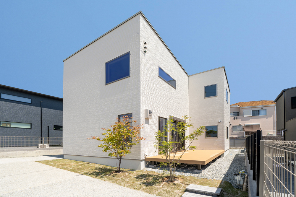 シンプルさが魅力のキューブ型。モノトーンでスタイリッシュな印象です。 リビングの延長上にウッドデッキを設けアウトドアリビングとしてくつろぎの空間を演出します。 洗濯物とお布団も同時に干せる大型バルコニーは、ガーデニングスペースとしても楽しむ事が出来ます。