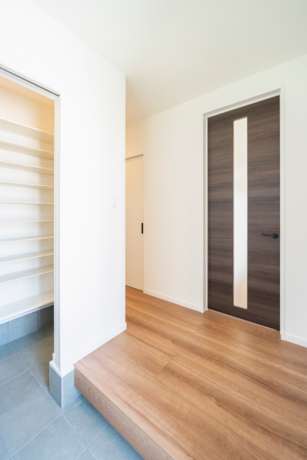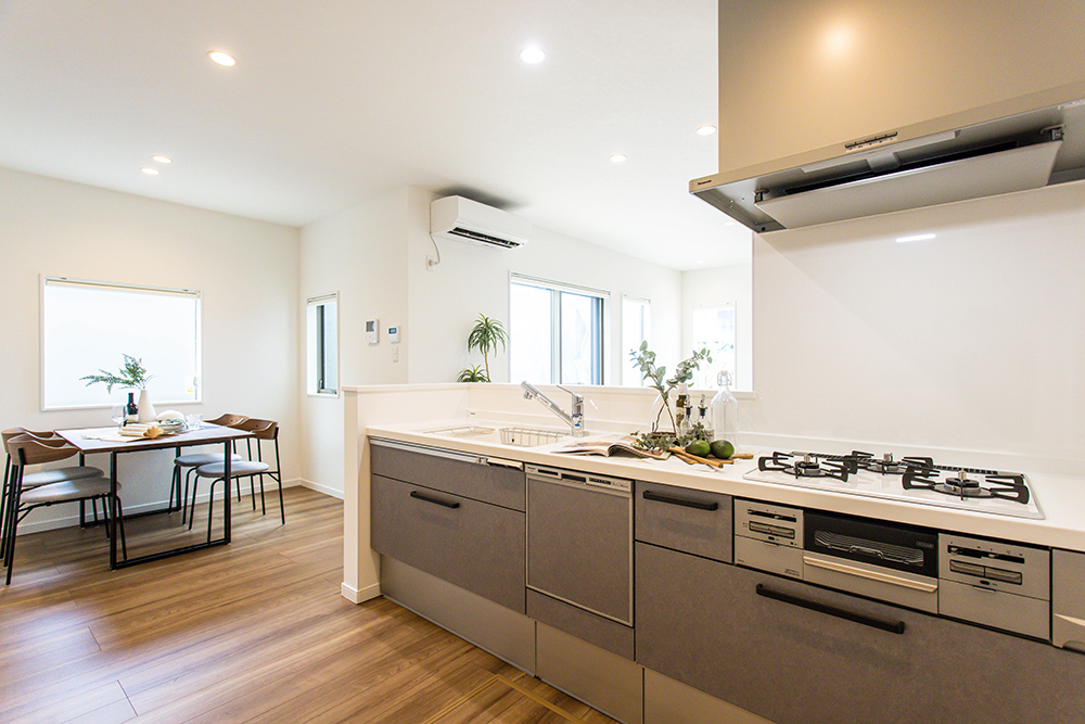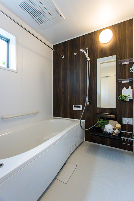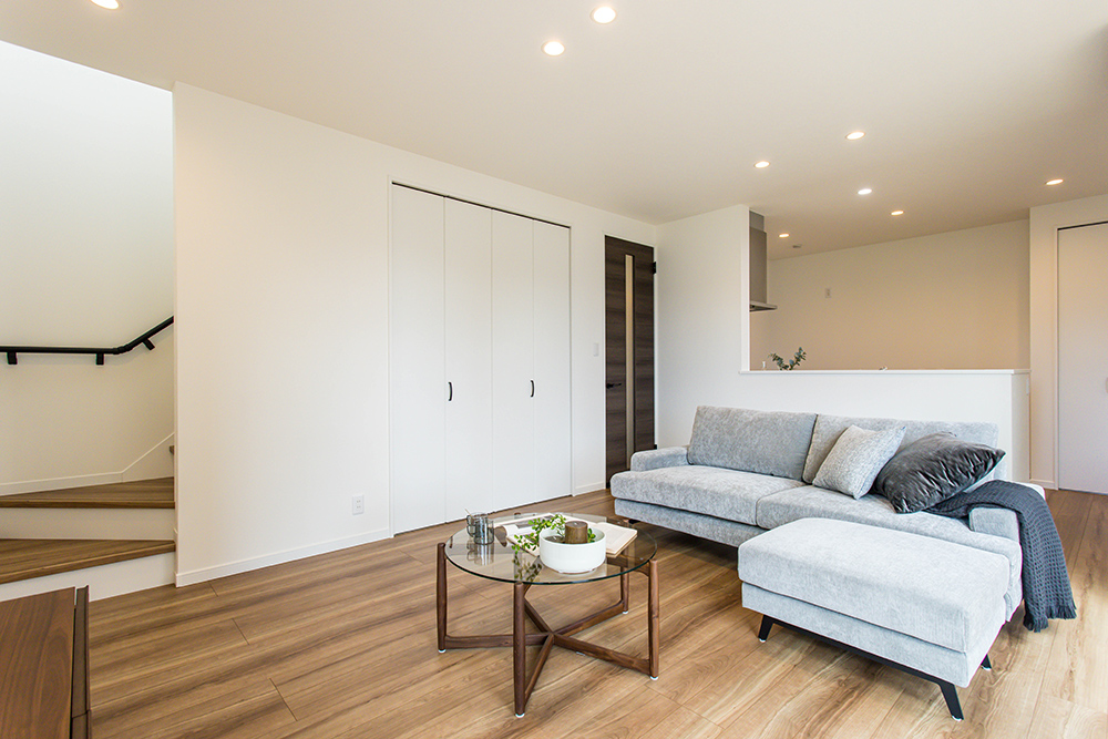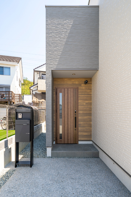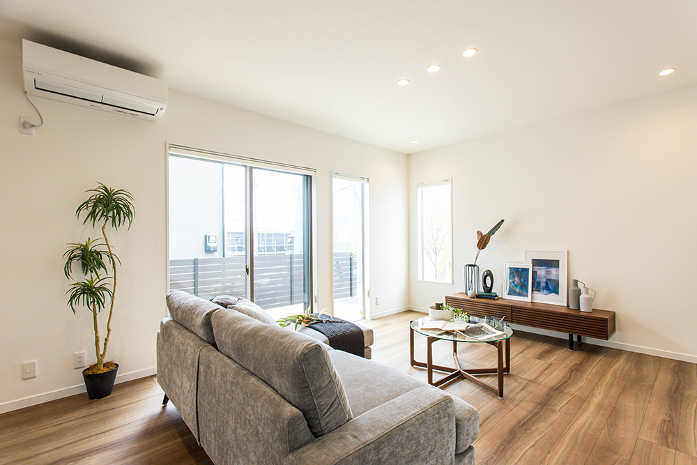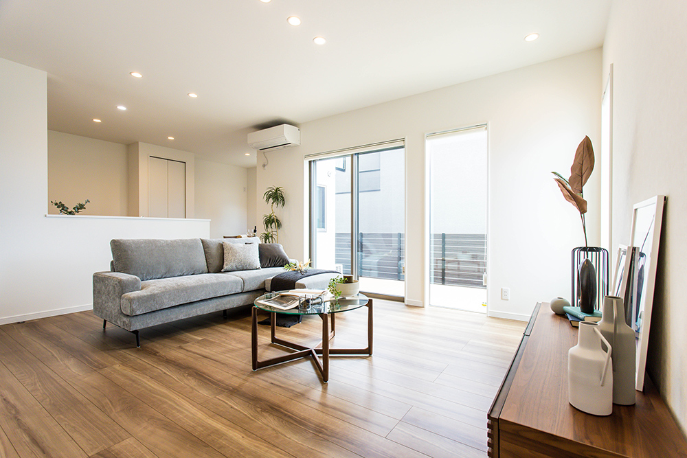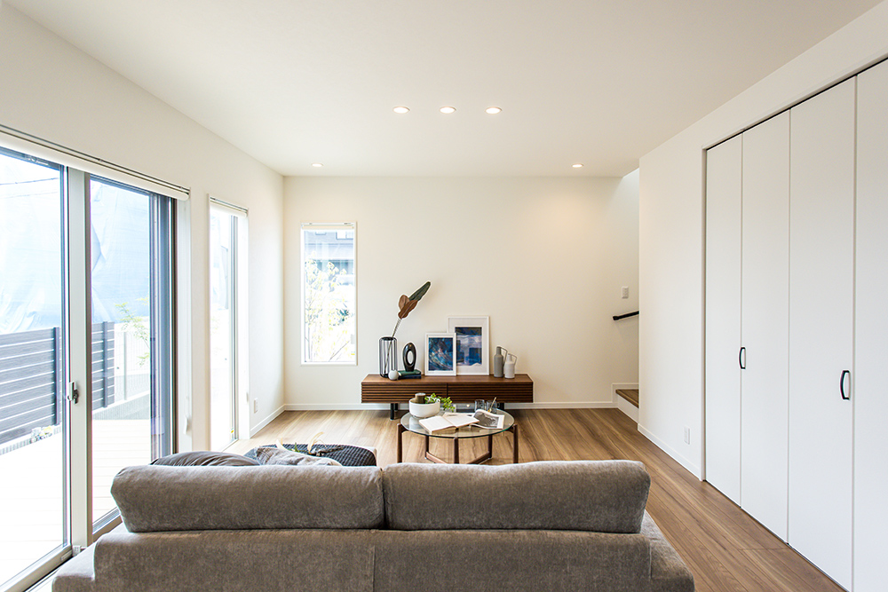 シンプルさが魅力のキューブ型。モノトーンでスタイリッシュな印象です。 リビングの延長上にウッドデッキを設けアウトドアリビングとしてくつろぎの空間を演出します。 洗濯物とお布団も同時に干せる大型バルコニーは、ガーデニングスペースとしても楽しむ事が出来ます。