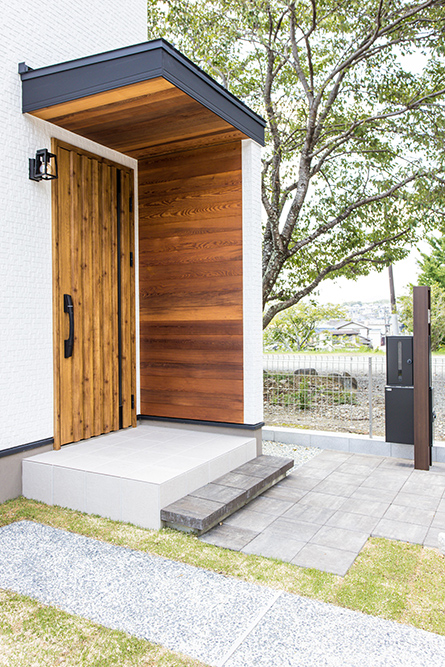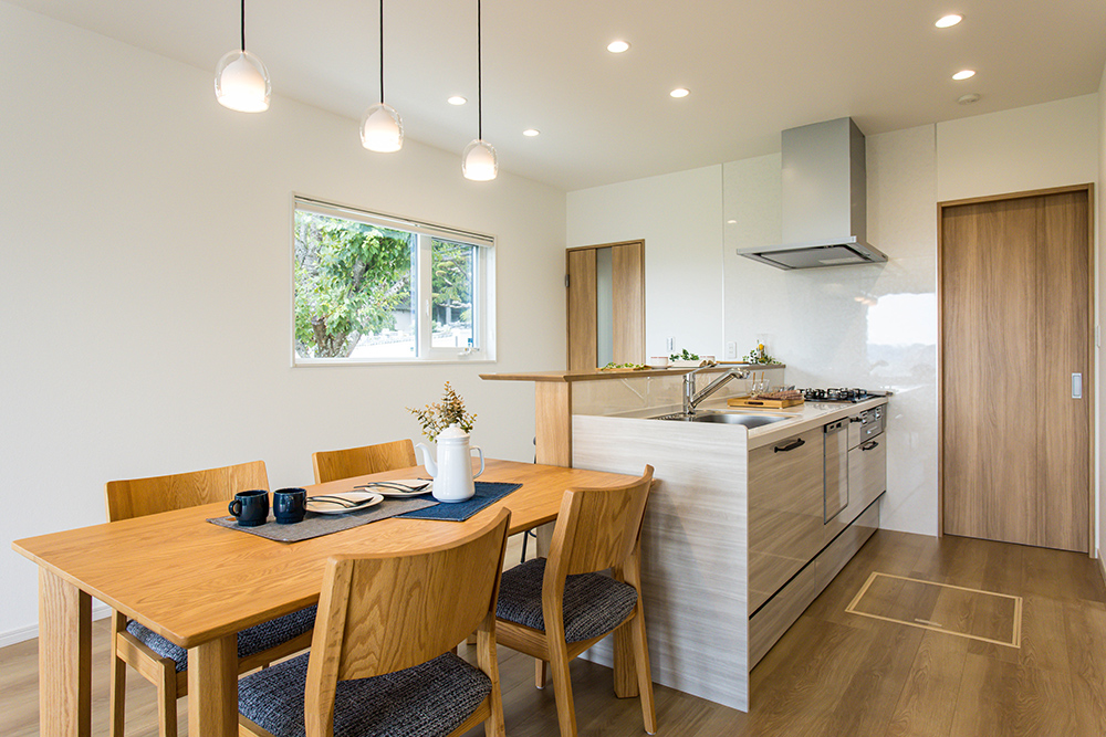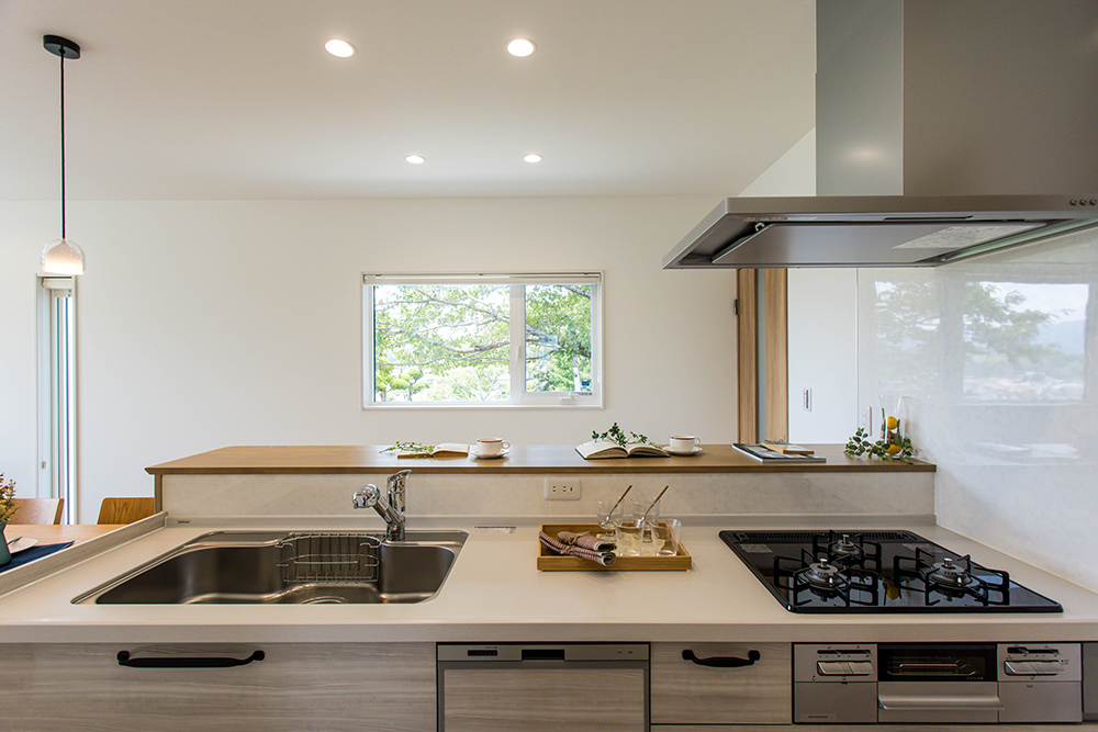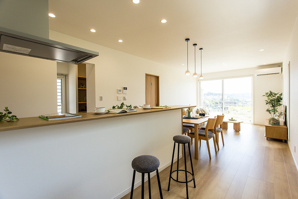 アクセントにレッドシダーを採用したナチュラルデザイン 家事動線とパントリーにこだわった暮らしやすい家 スタイリッシュなカフェ風 カウンターテーブルも魅力です。