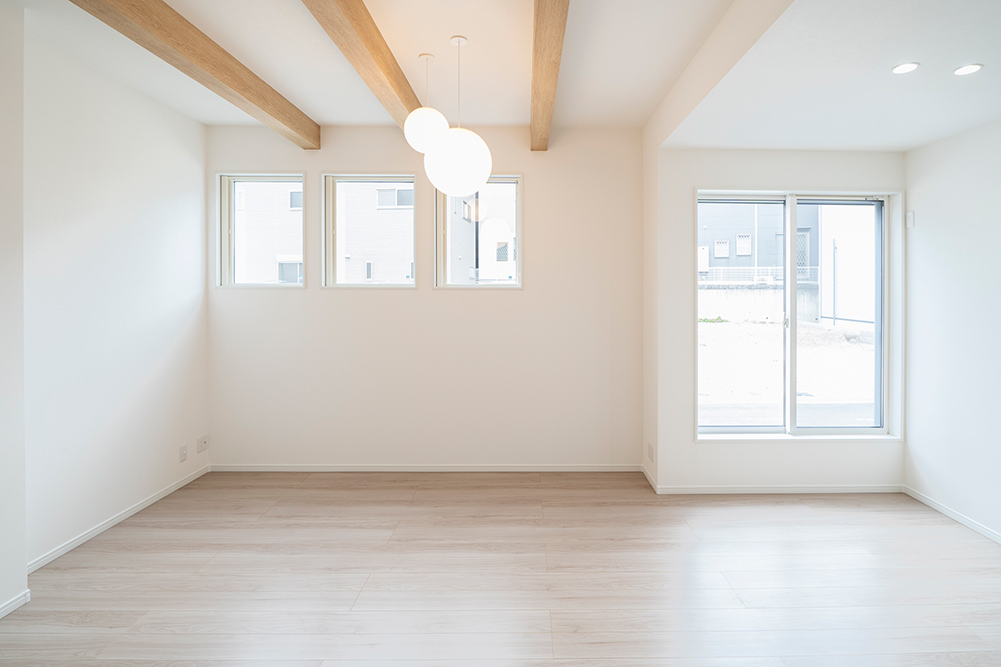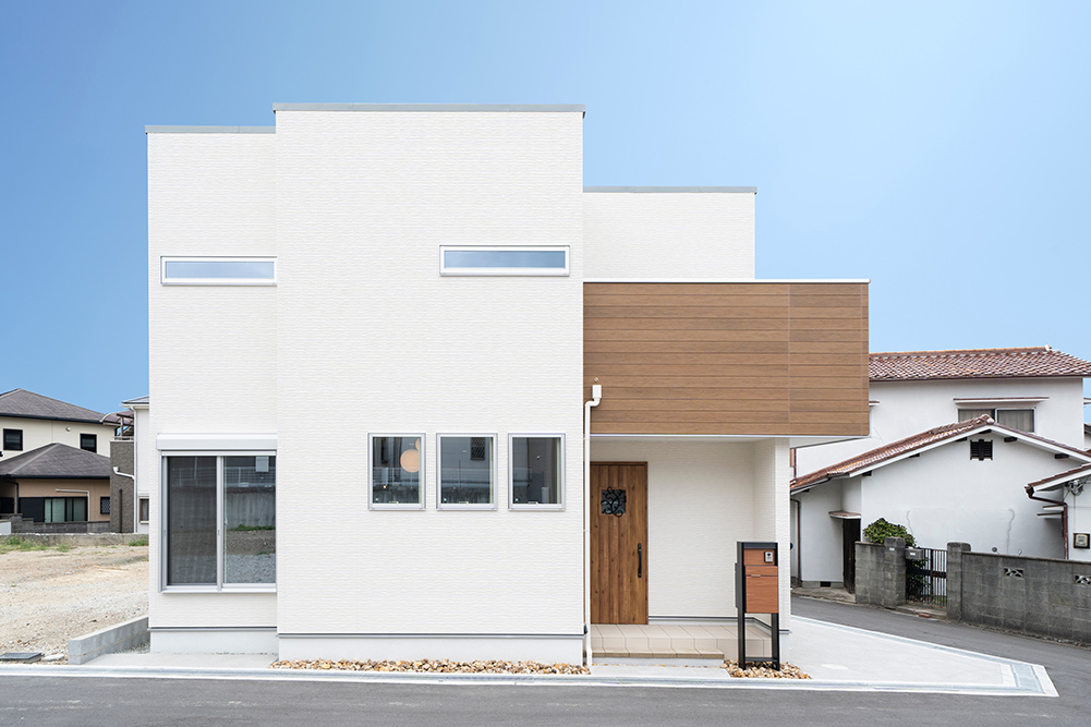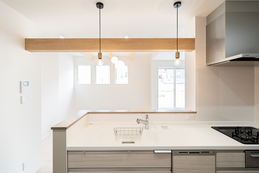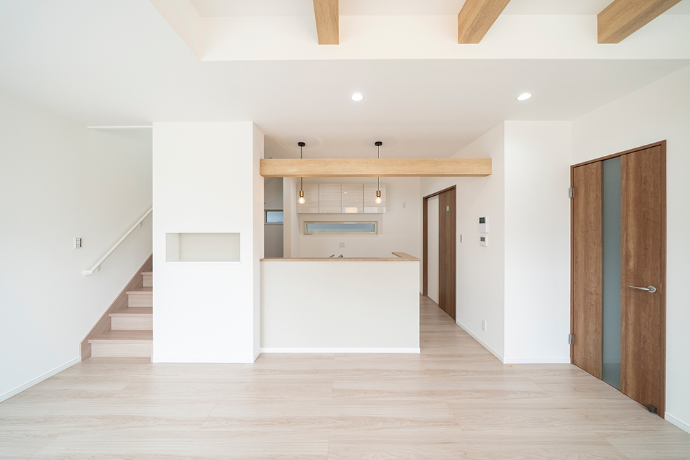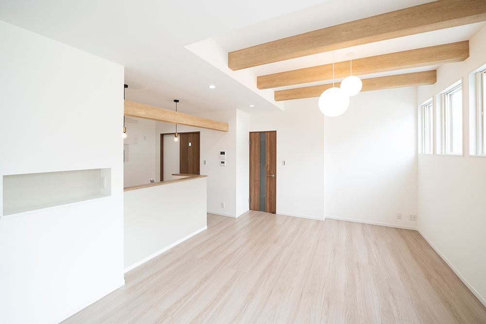 白い壁に木目調をアクセントにした直線ラインが美しい外観 開放的で奥行きのある空間をつくり出せる「見せ梁」 やさしい木の質感がリビングのアクセントに!