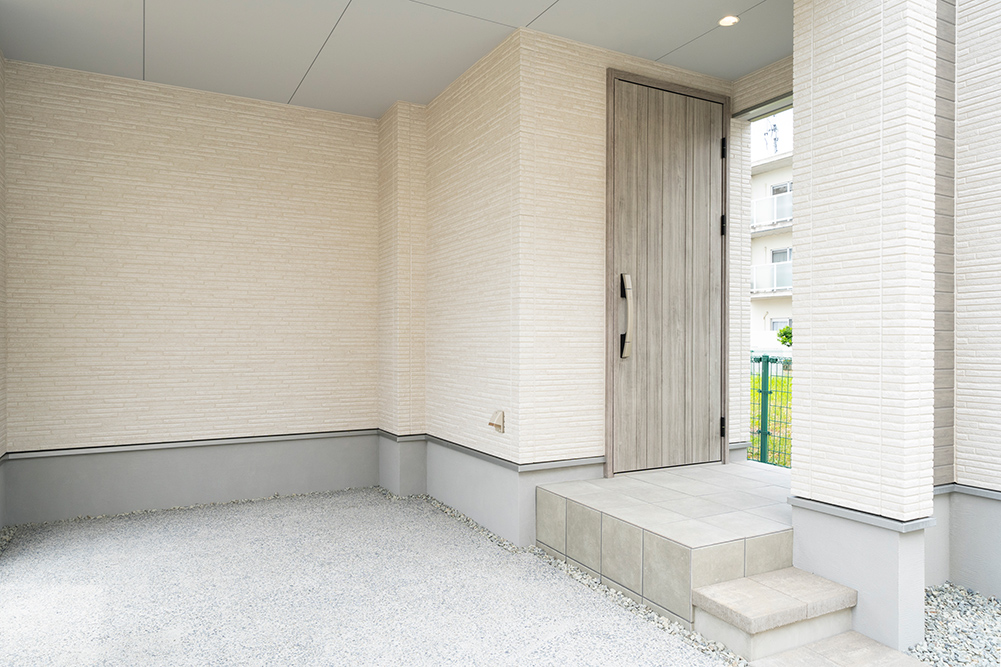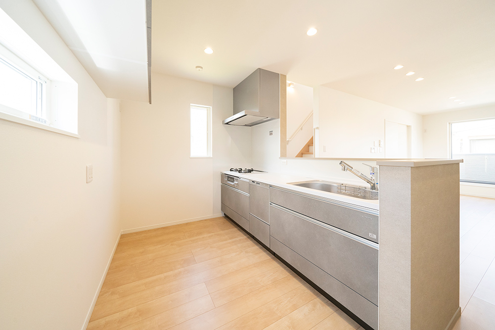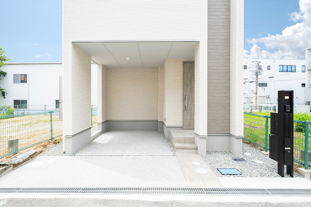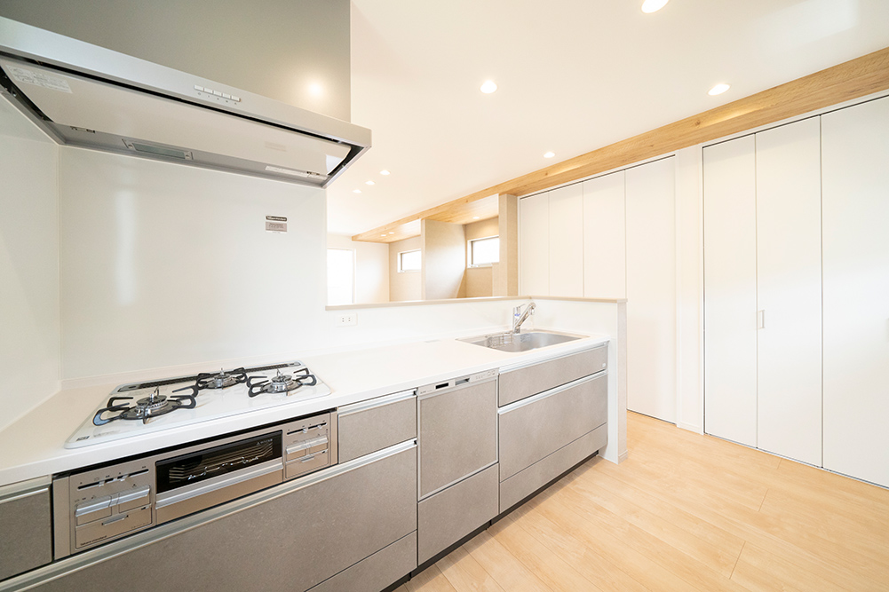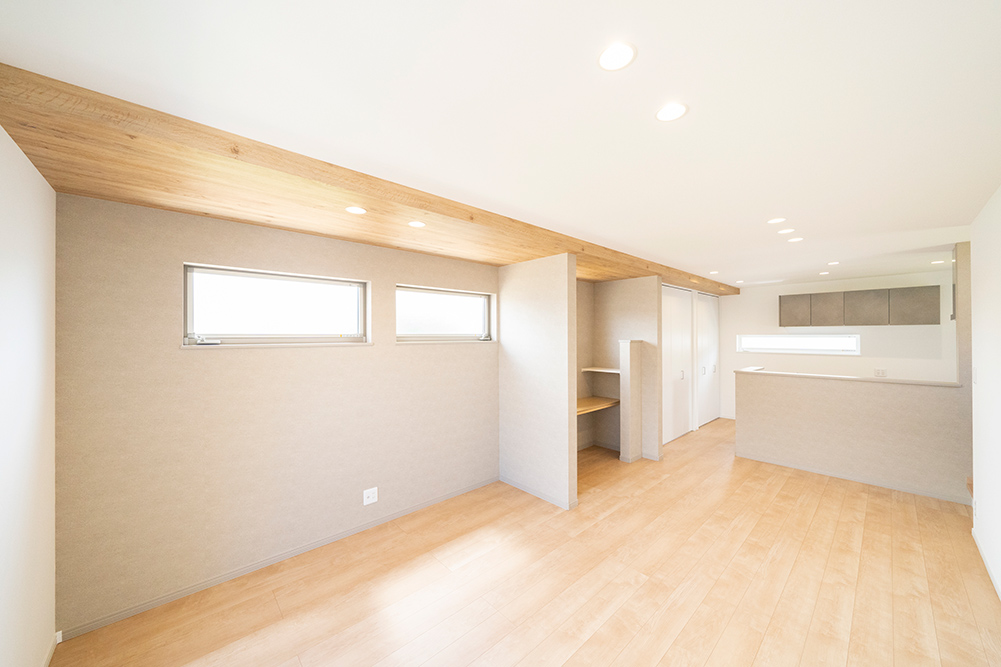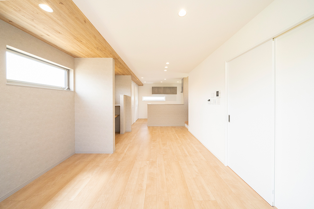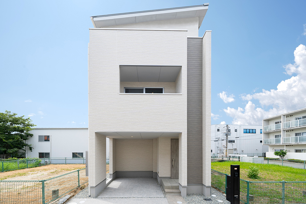 人気のグレーカラーをアクセントにした、凹凸感のある立体的なスタイリッシュなファサードです。 リビング側面に天井を折り上げることで空間に奥行きと広がりを演出した開放感あふれるリビングです。