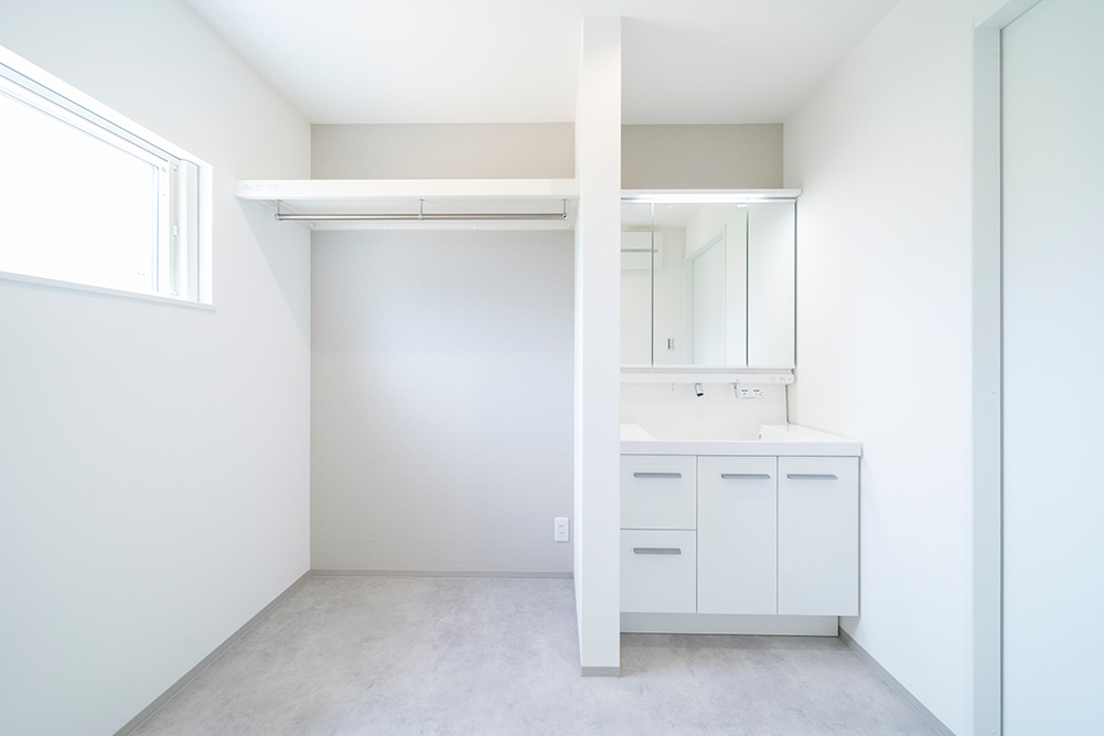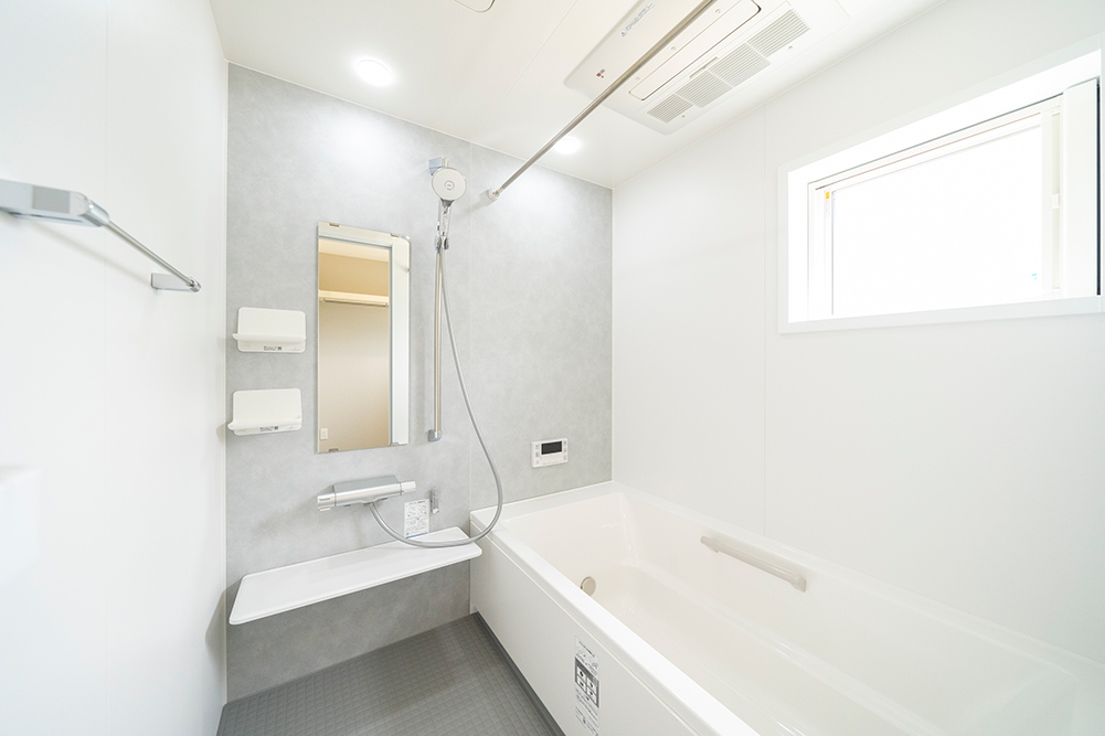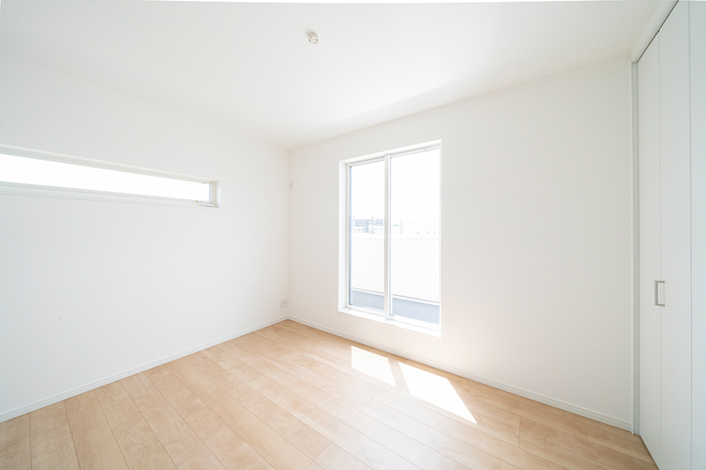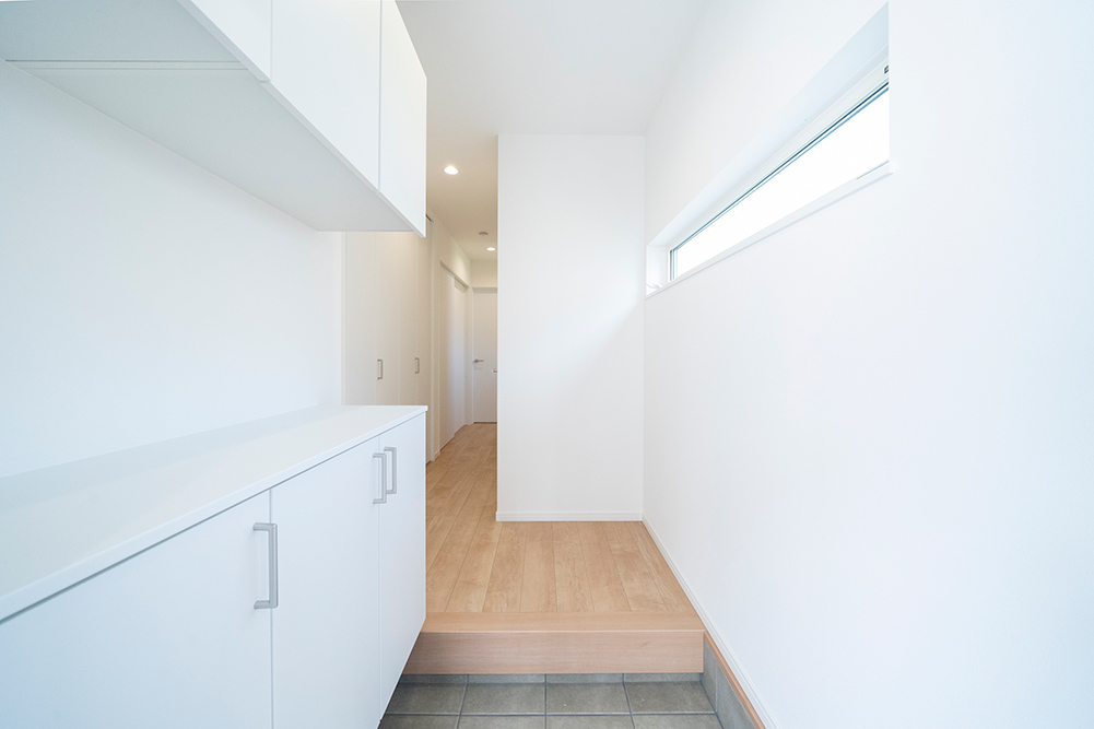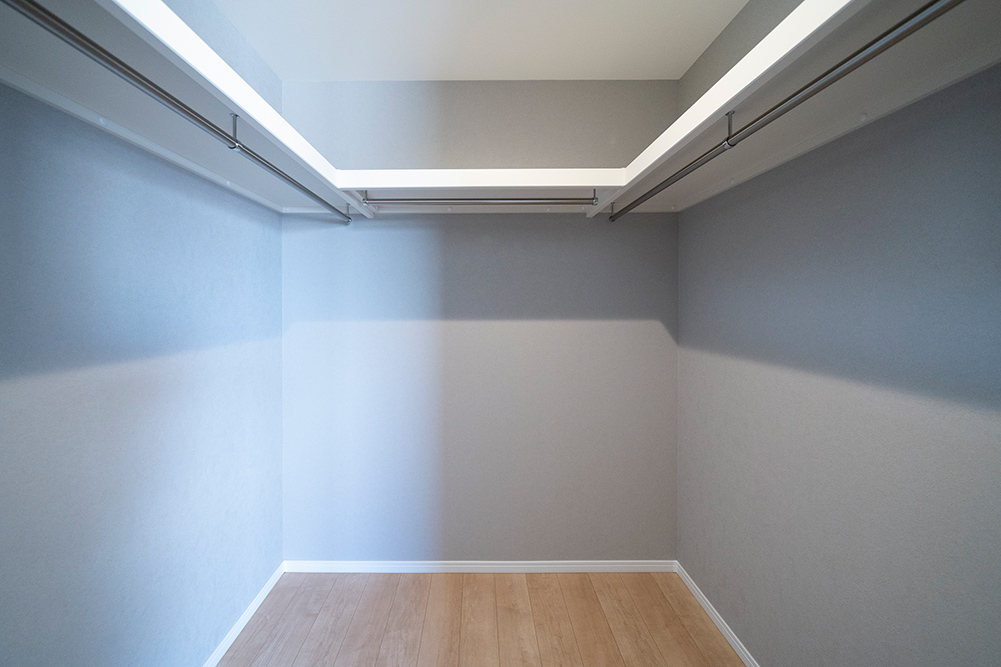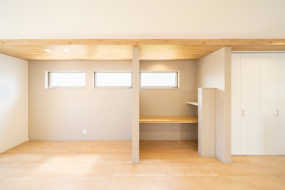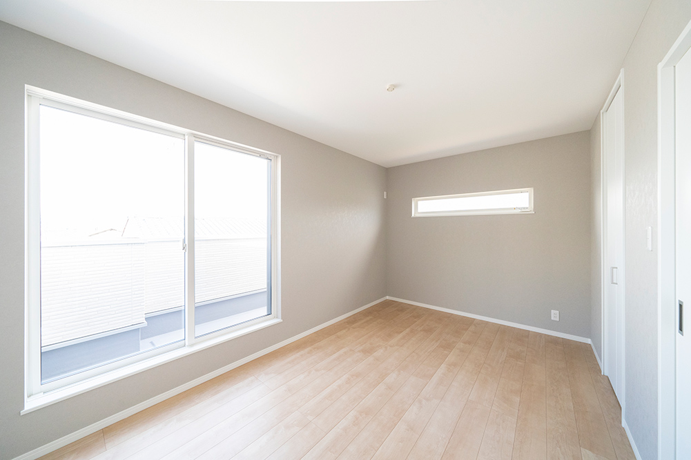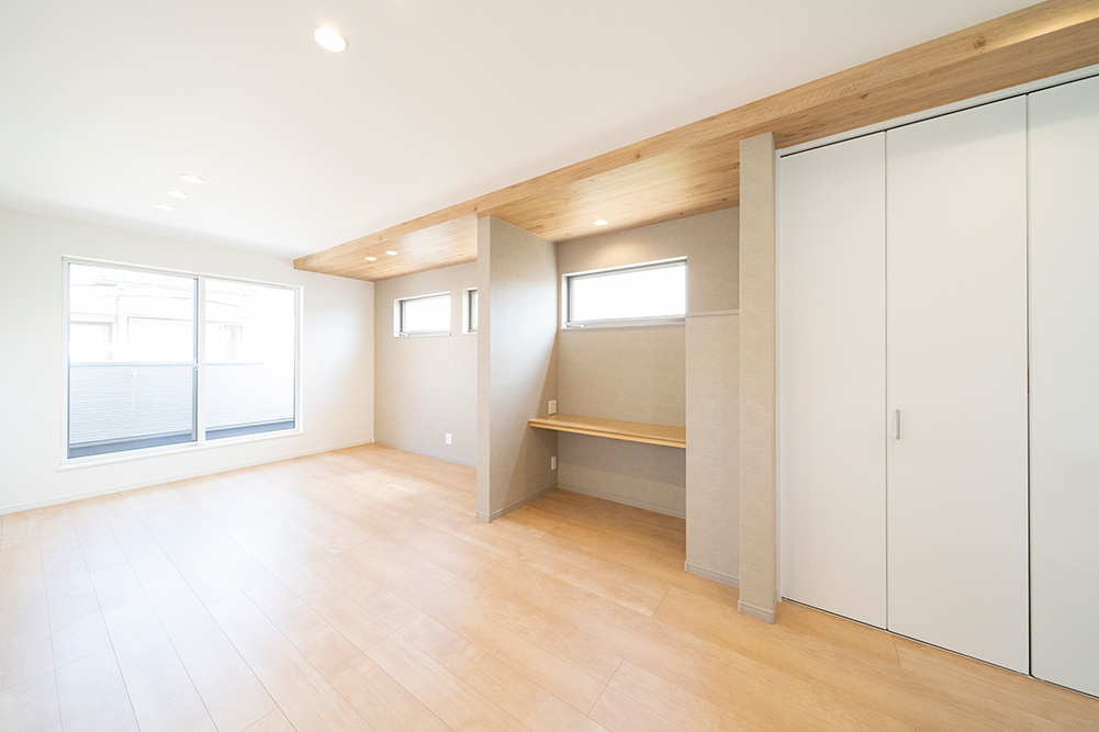 人気のグレーカラーをアクセントにした、凹凸感のある立体的なスタイリッシュなファサードです。 リビング側面に天井を折り上げることで空間に奥行きと広がりを演出した開放感あふれるリビングです。