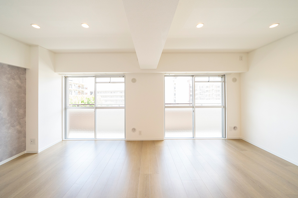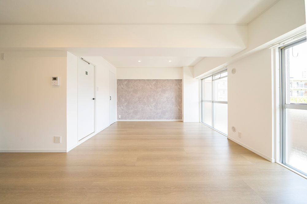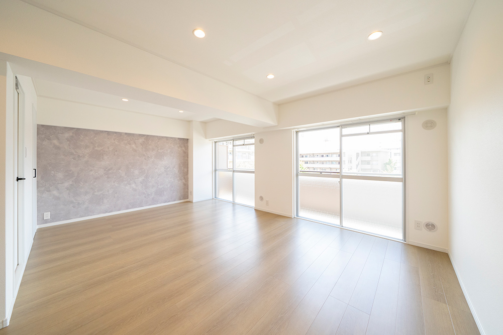 公募面積496.5㎡ 共有部分4965分の381 専有面積 60.1㎡/バルコニー面積 7.0㎡ 18.2帖の広々リビングは家族みんながくつろげる空間。 ゆったりした気分で家族が自然と集う場所です。 陽当りの良い南向きワイドスパンの家