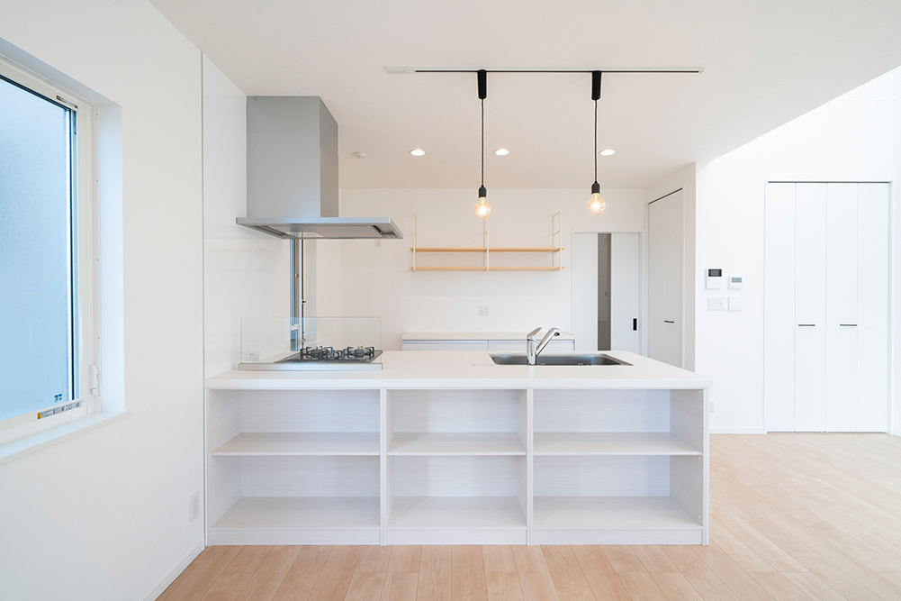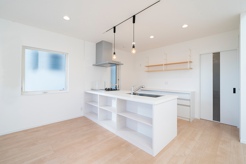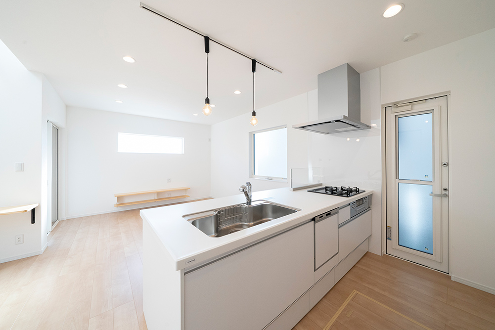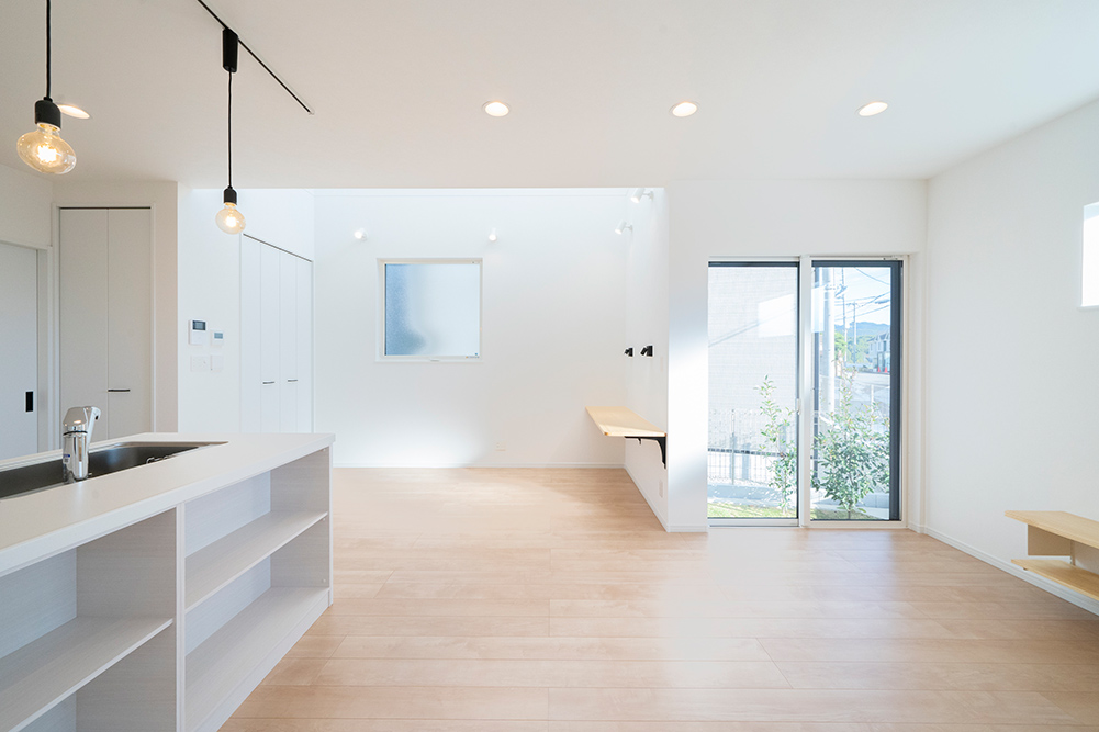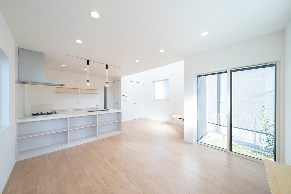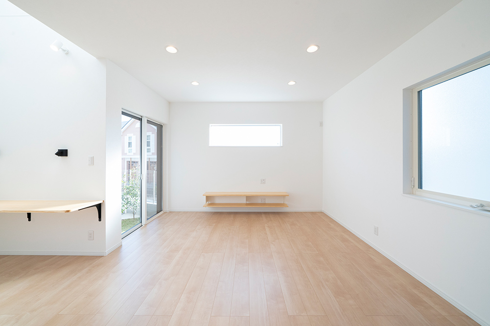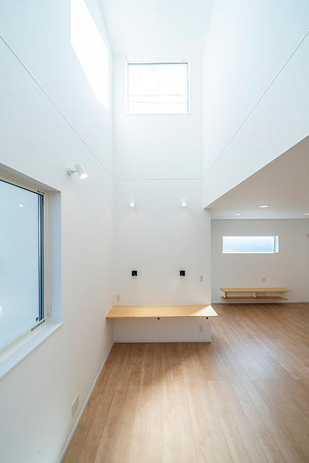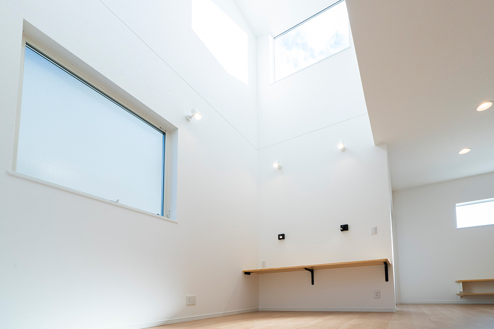シンプルモダンなスクエア型デザイン。 広さ18帖のLDK上部に吹抜けを採用し、開放的で明るいリビング空間を演出。