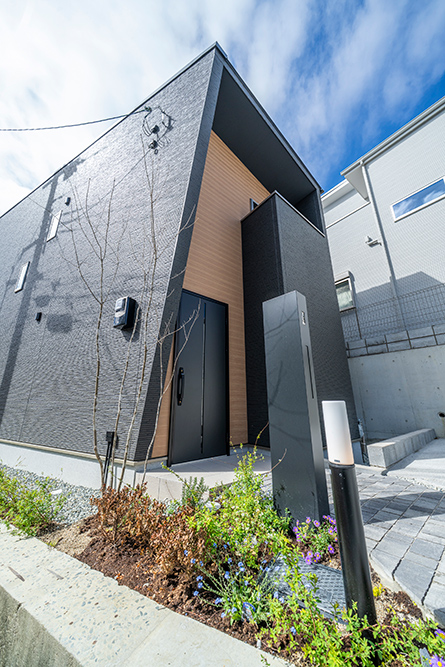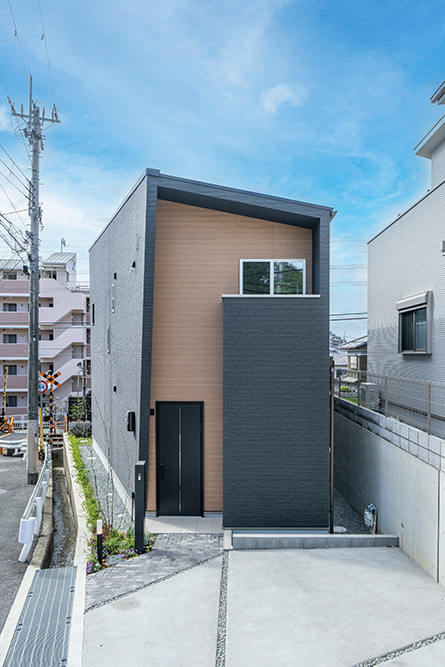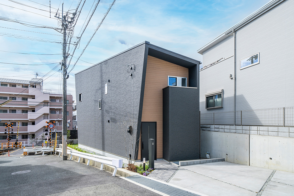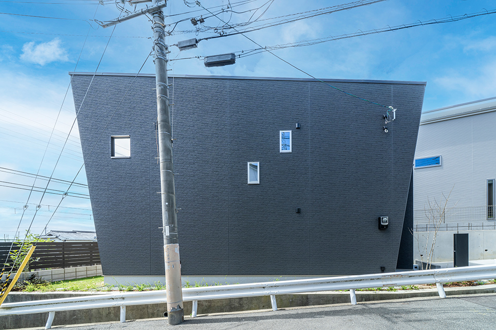 エッジが効いた個性的なファサード オブジェのような存在感があり、角度によって異なる表情を魅せる奥深いデザイン