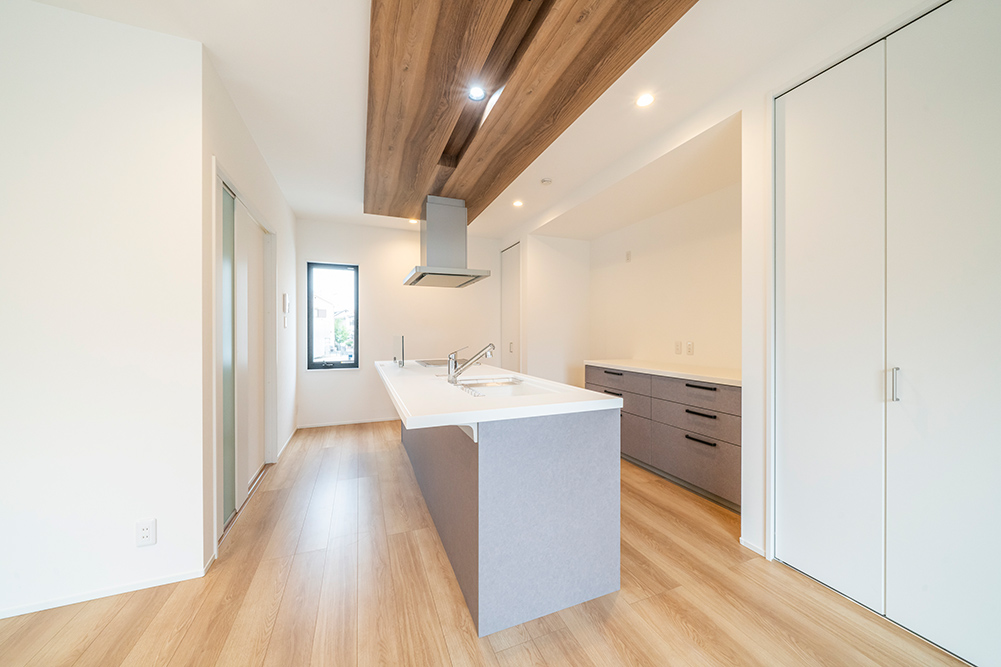 落ち着きのある空間に個性のあるスタイリッシュモダンの家 アイランドキッチン×照明を施した折り下げ天井 デザイン性の高いキッチン空間です。