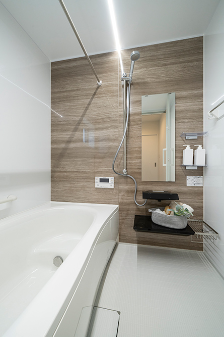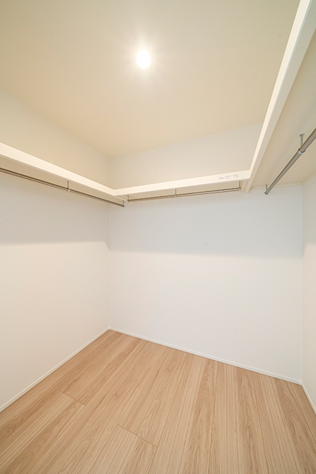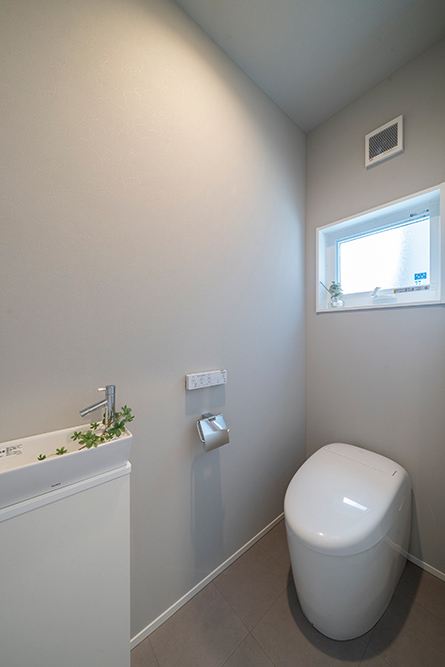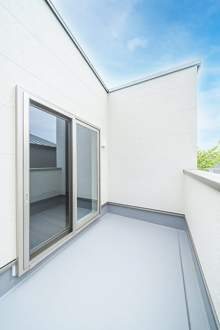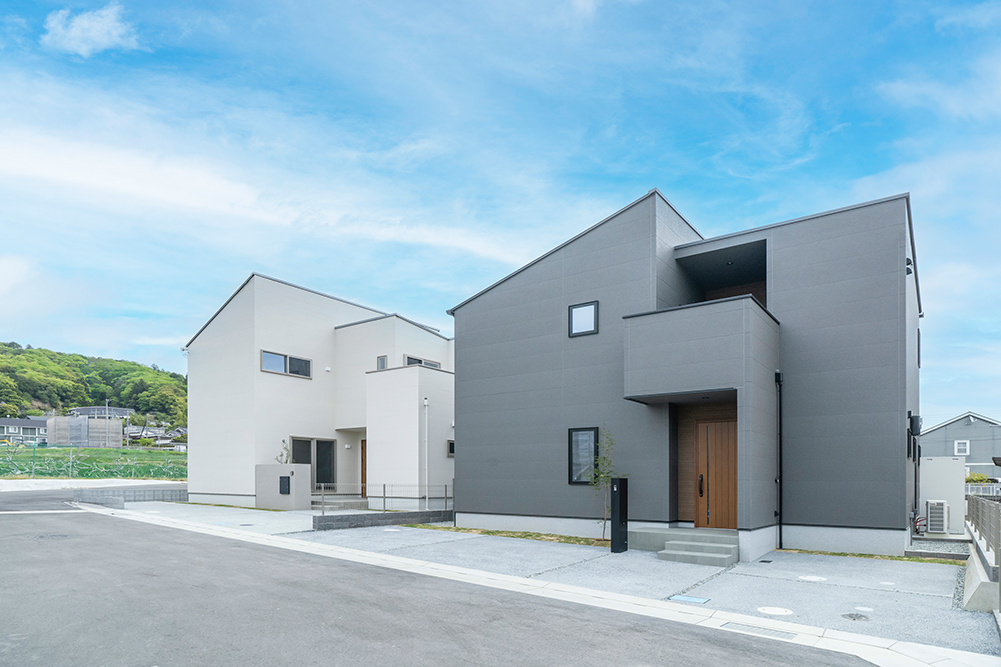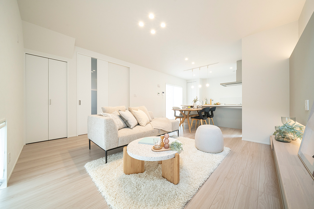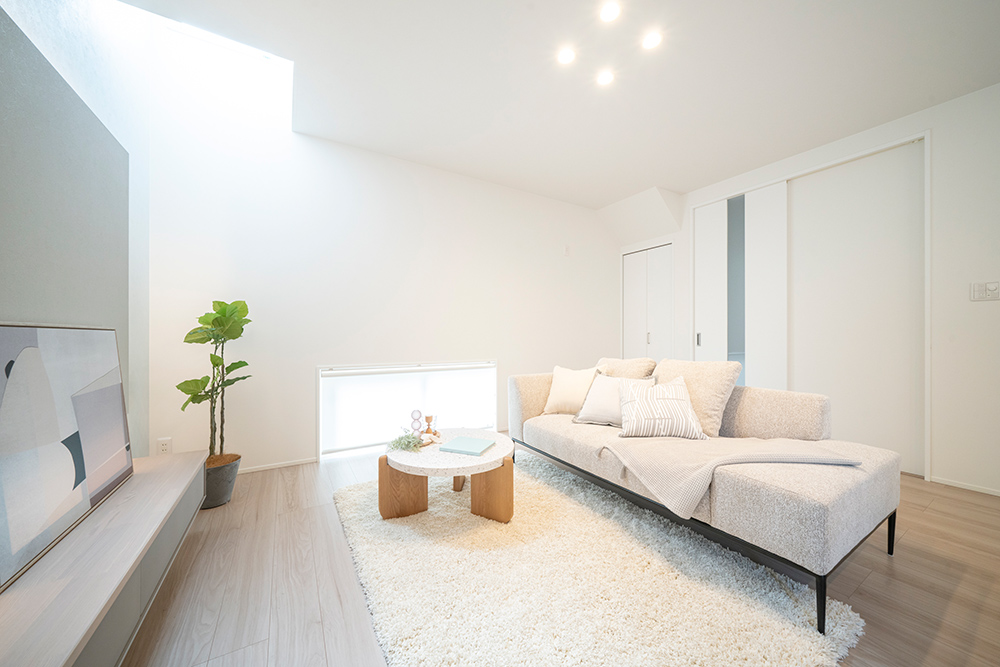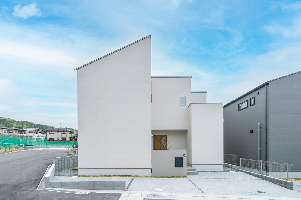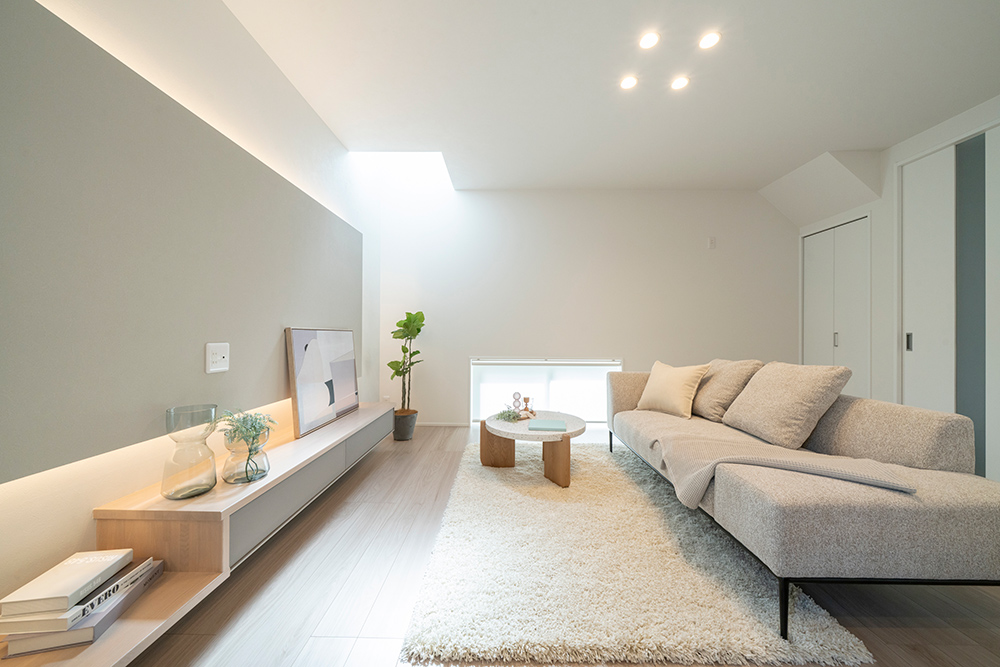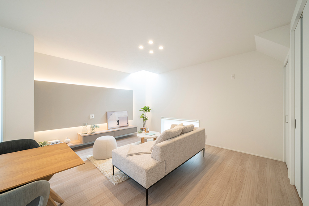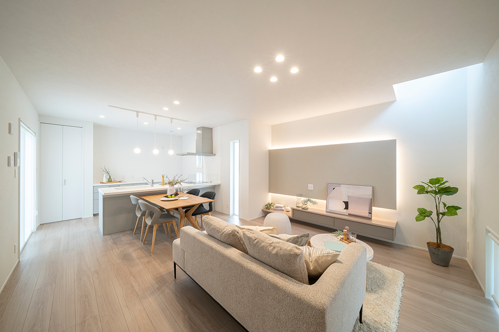 白を基調としたスタイリッシュなファサード 広々とした玄関ポーチが魅力のシンプルモダンなアプローチ ロングカウンター×間接照明は落ち着きのあるリビング空間を演出 省エネと安全性を兼ね備えたオール電化住宅