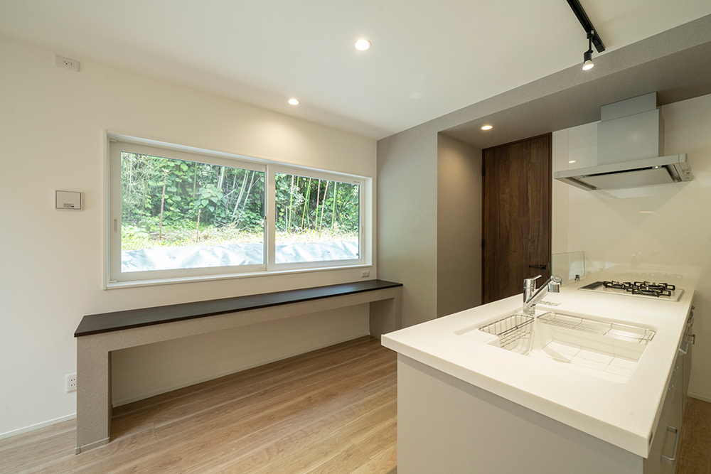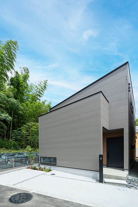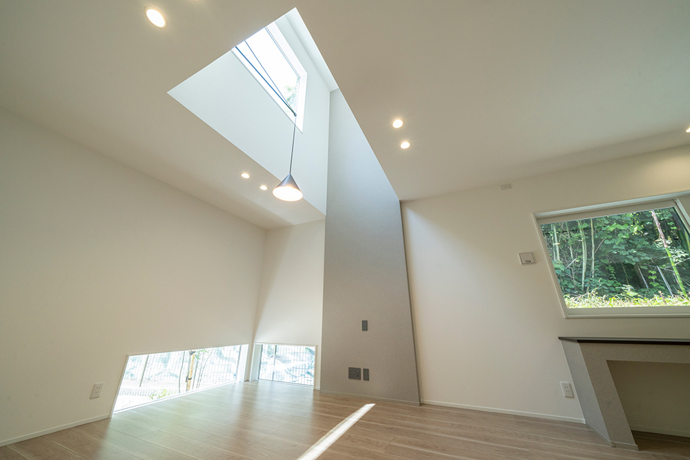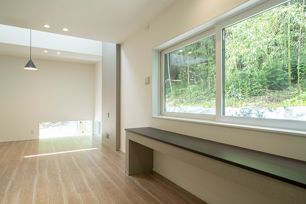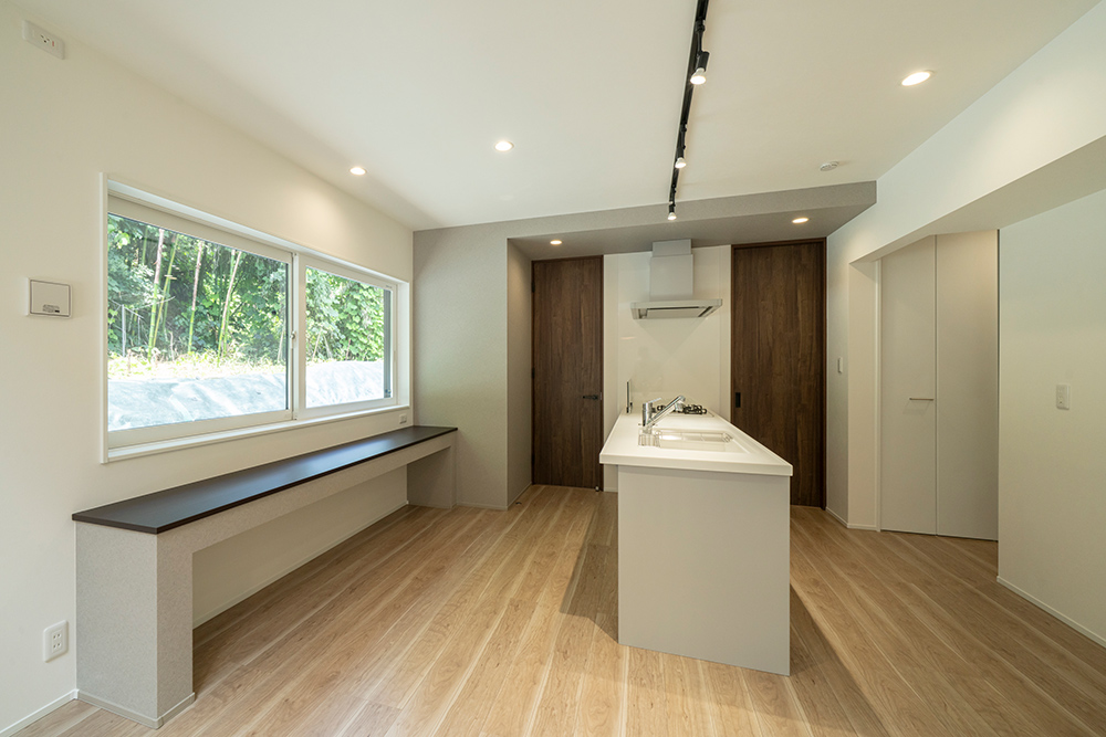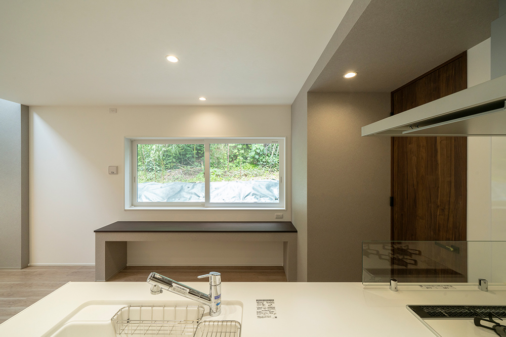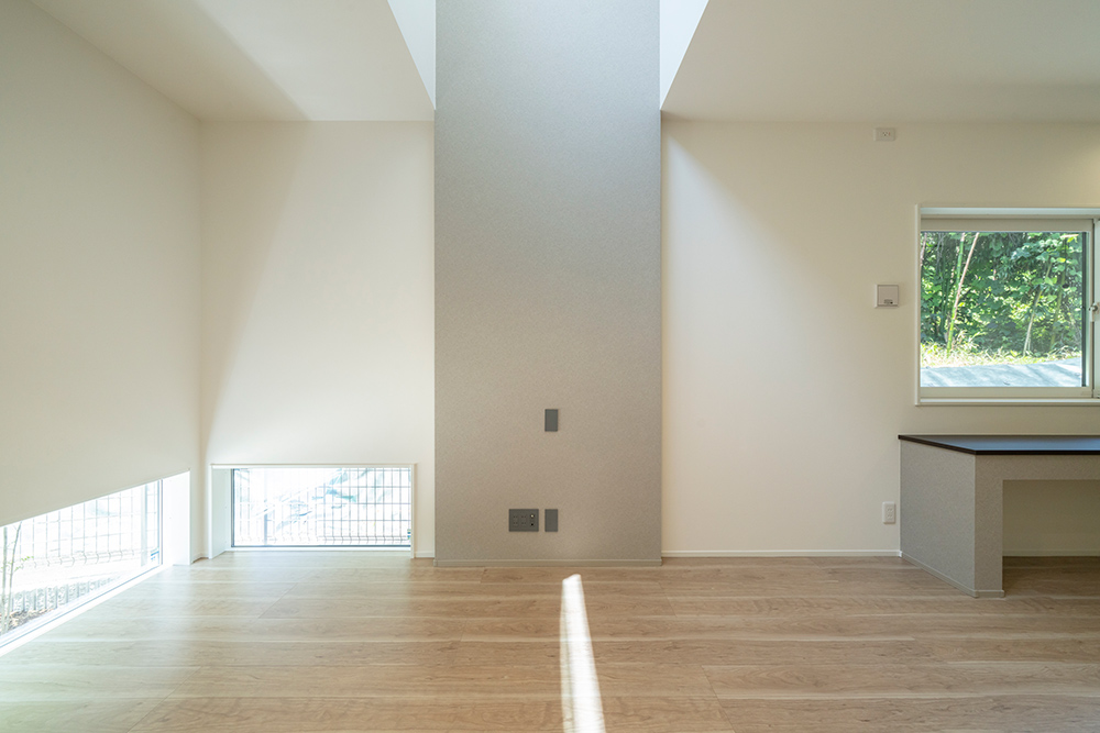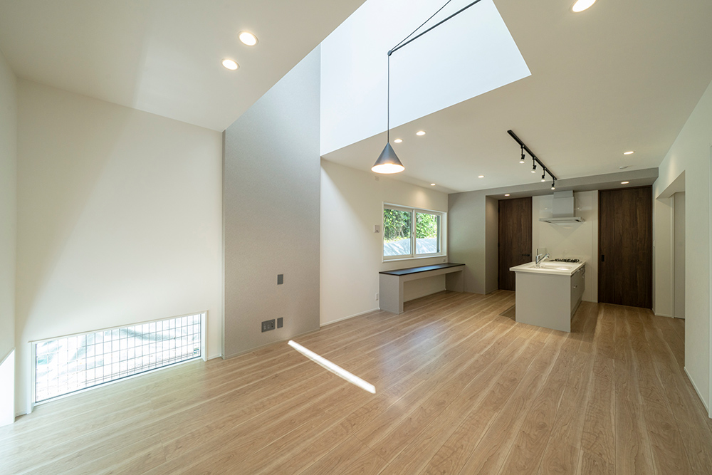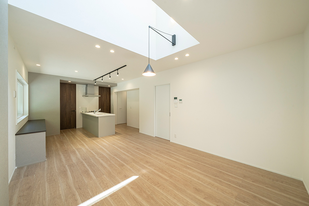 アクセントに木目調をあしらったシンプルモダンなファサード 18.8帖の広さがあるリビング内に暮らしを快適にするカウンターを設置。 上部に吹抜けを採用し、開放的で明るいリビング空間を演出