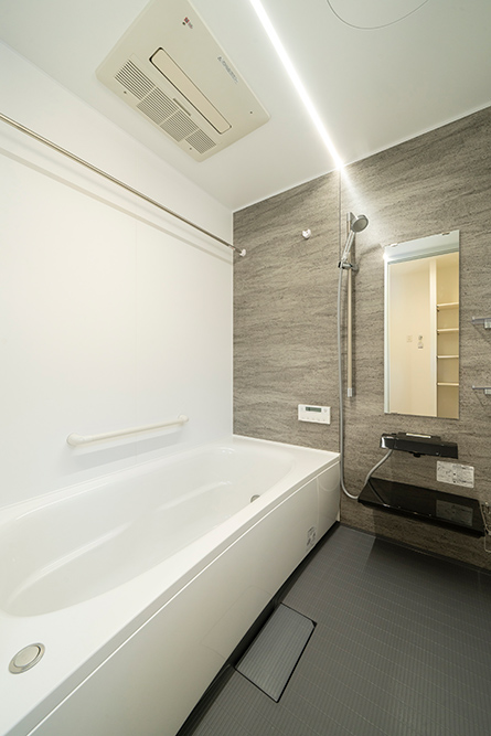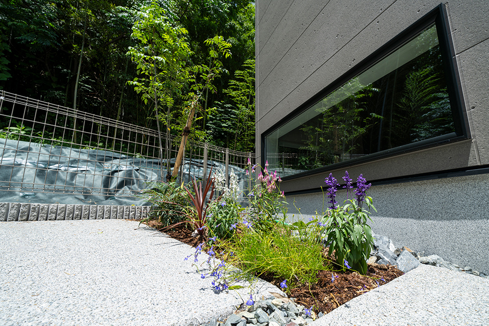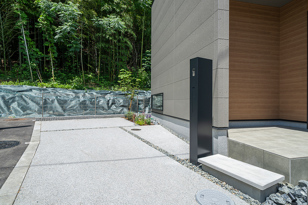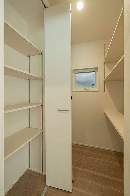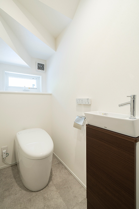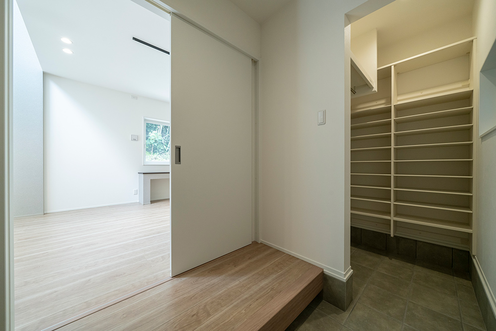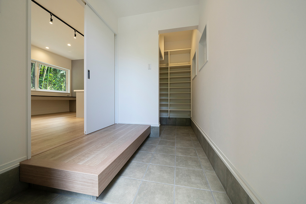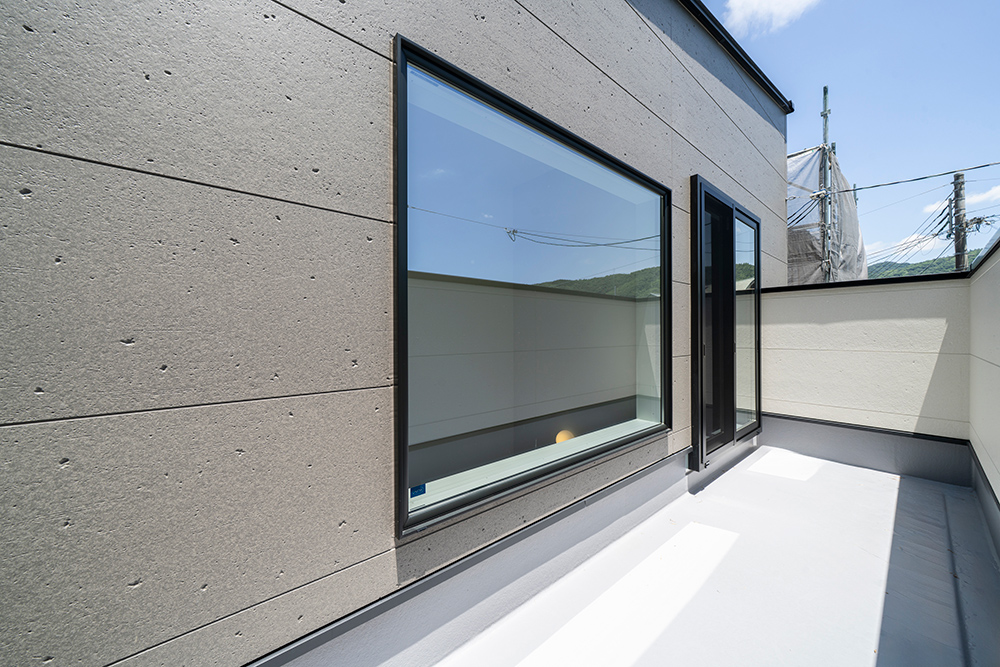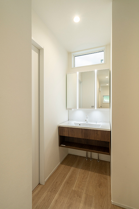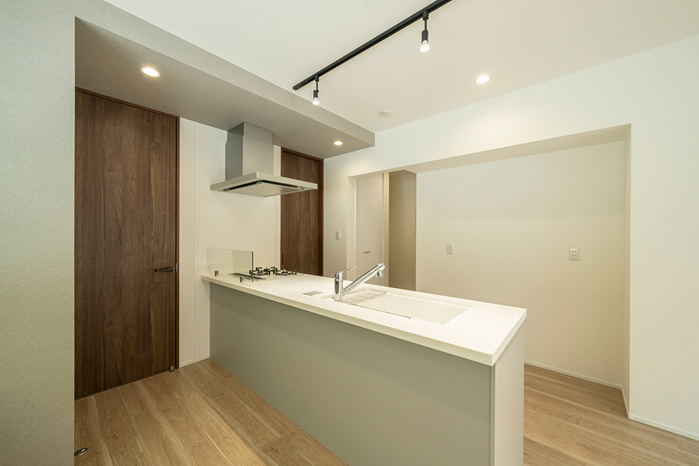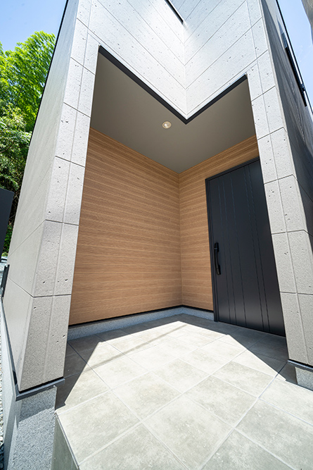アクセントに木目調をあしらったシンプルモダンなファサード 18.8帖の広さがあるリビング内に暮らしを快適にするカウンターを設置。 上部に吹抜けを採用し、開放的で明るいリビング空間を演出